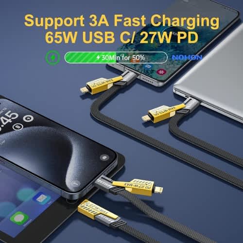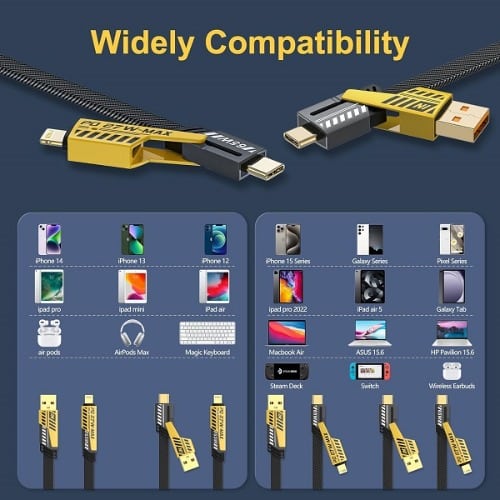 All-in-one Convenience, The 4-in-1 Cable is perfect for anyone who needs to charge multiple devices on the go. Whether you have Apple, Android, or a mix of devices, this cable keeps you powered up with ease.