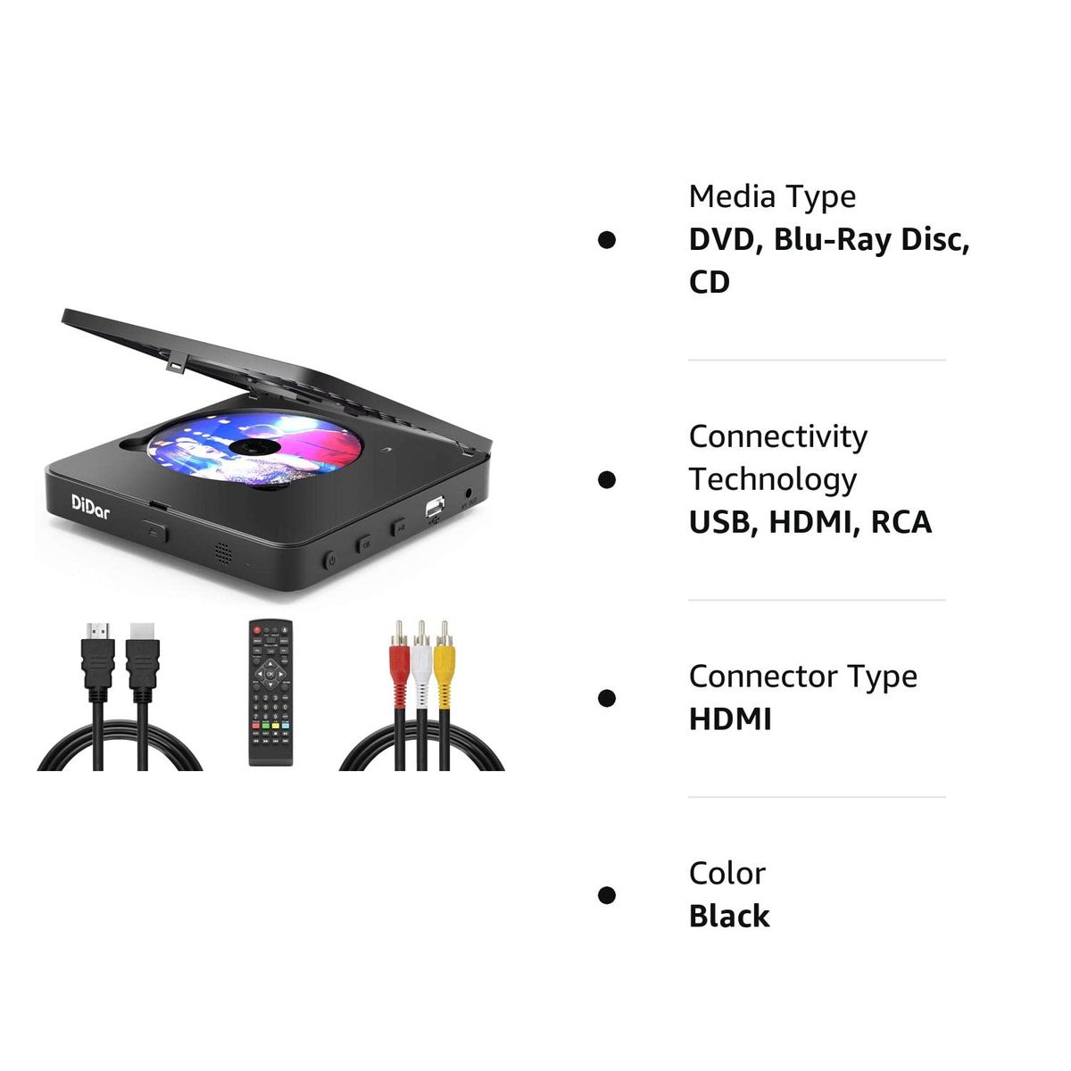 This mini Blu-ray DVD player supports HDMI or AV cable to connect to a TV or projector to share the happiness of the big screen with family and friends. In addition, the HDMI cable and AV cable are included in the package.