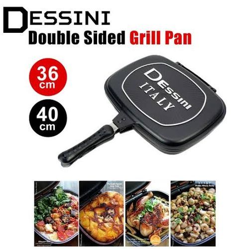 Non Stick Double Side Grilled Pan, cake pan. fish pan Impress your friends and family with perfectly grilled meat dishes and meals with the help of the Dessini Double Sided Pan. Now you don't have to pay ridiculously high prices for those perfectly grilled meat dishes when you can make it right in your own kitchen! Two Surfaces . The Double Sided Pan provides two types of surfaces - a flat surface and a riffled surface. Both sides distribute the heat evenly so you are able to get perfectly grilled meat every single time! Other than grilling, the Double Sided pan is also ideal for frying and also can be used as a pressure pan so you can experience meats that are falling of the bone without sacrificing hours of your time! Die-cast aluminum with non-stick coating.Super Quality Non-Stick Coating Double Grill Pan turns out everything great. It provides the best taste and keeps the high- nutritive value of food.. Its handles stay comfortably cool on the stove top and it's clean up is easy too. Perfect to fry eggs and prepare barbeque while camping and picnic.