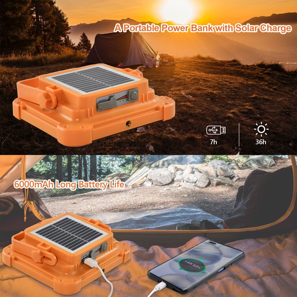 【 Rechargeable & PowerBank 】The rechargeable work light can be powered by solar energy or USB cable. it is extremely suitable for outdoor sports in sunny weather. And the solar work light can be used as a backup power bank, which can charge your mobile phone when you need.