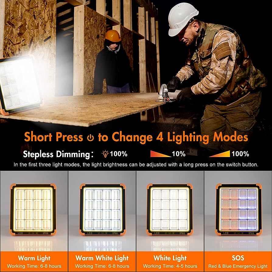 【 Stepless Brightness Adjustable & 4 Lighting Modes 】This led work light provides 4 brightness Modes: White/Warm/Warm White color lights with red blue shinks SOS warning light. Long Press to adjust the brightness meets your needs for different working scenes.