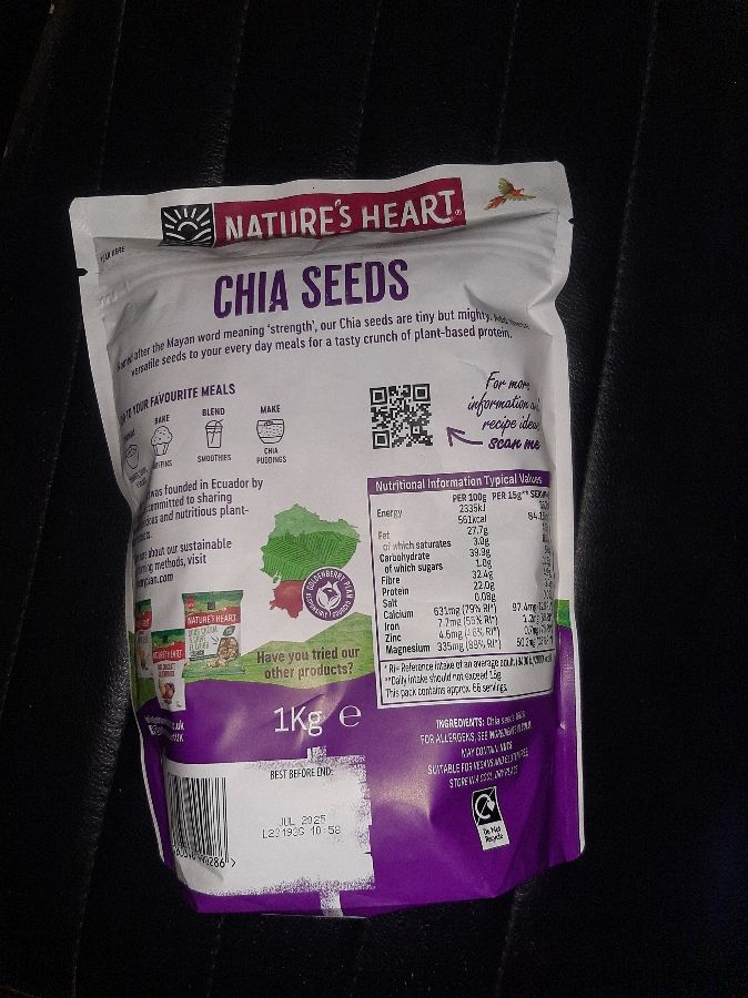Nature's Heart Chia seeds are a great source of Protein and Fibre, with high levels of Iron, Calcium and Omega 3. Our Chia seeds are Gluten free, Wheat free, Dairy free and Vegan friendly! Chia seeds organic nature aid hair and nails while combating fatigue. This versatile seed can be used to create a healthy snack; whether you want to soak them, bake them or sprinkle them to add to vegan snacks or create a high protein snack.