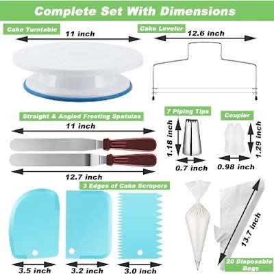 35 Pieces Cake Decorating Kit: 11 inch cake turntable for decorating, 7 icing tips, 2 straight and angled icing spatula, 1 cake leveler, 1 coupler, 20 disposable bags, 3 cake scrapers icing smoother set for beginners