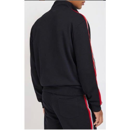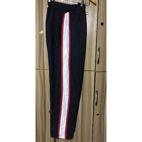 It has a white and red line at both sides of the joggers and sweatshirt. It has free space legs.it is machine washable and it is neatly sorn.