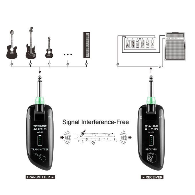 WS-50 adopts digital UHF radio frequency wireless transmission technology. With strong anti-interface ability and stable signal transmission, it is perfect for stage performance of guitar or bass players.