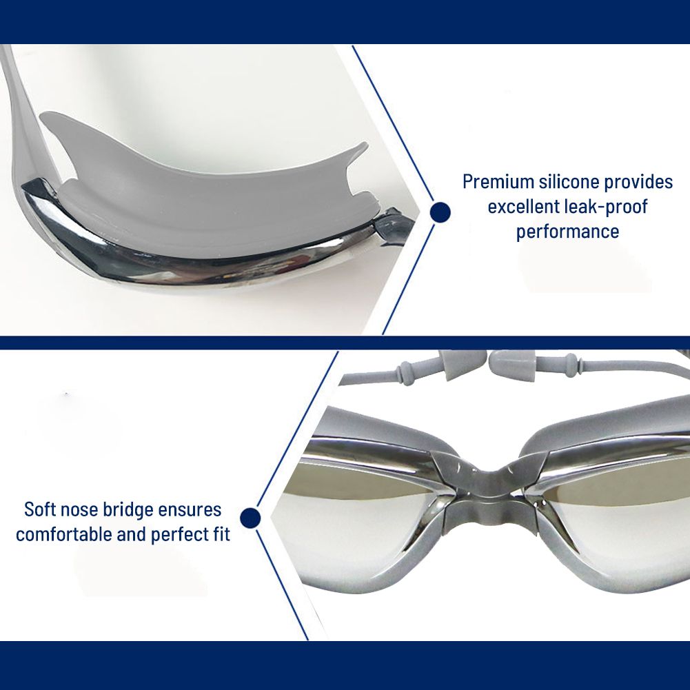 The integration of electroplated swimming goggles and earplugs is an optimal choice for outdoor water sports. Boasting excellent performance in anti-fog and UV protection, it offers you excellent visibility and eye protection under water. Ergonomic design with soft silicone achieves a perfect fit and never allows water leak in. Quick-fit buckle ensures easy wearing and attached box greatly protect your goggles from crushing. Enjoy water sports with our swimming goggles!