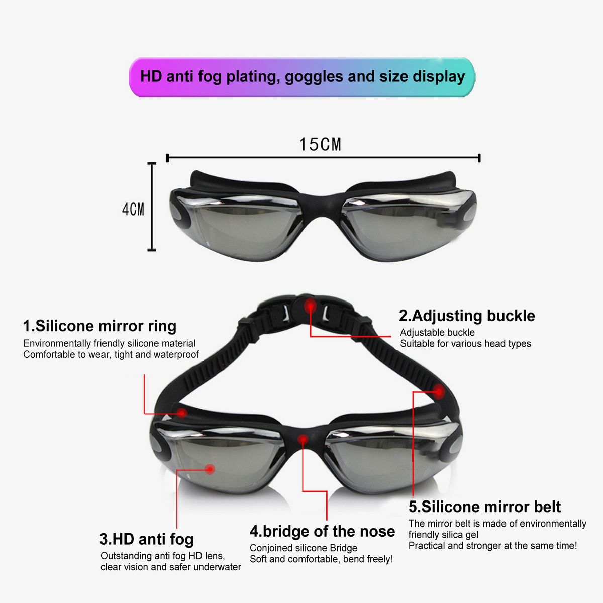 ENJOY YOUR SWIMMING--The Mirrored anti-fog goggles used poly-carbonate has incredible impact resistance. The nose clip and earplugs not only protect your nasal cavities and eardrum, but also improve your swimming performance.