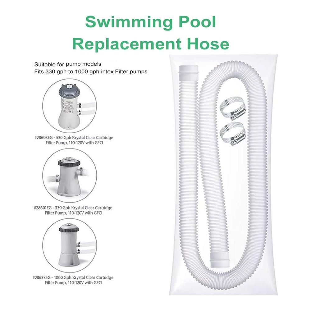 Compatible Pump Models: Pool Pump Hoses are compatible with all filter pumps 330 GPH, 530 GPH and 1,000 GPH, Intex Krystal Clear Cartridge Pump Filters and saline systems such as Intex 607, 637 Filter Pumps. Swimming pool hose with 1.25 inch ID.