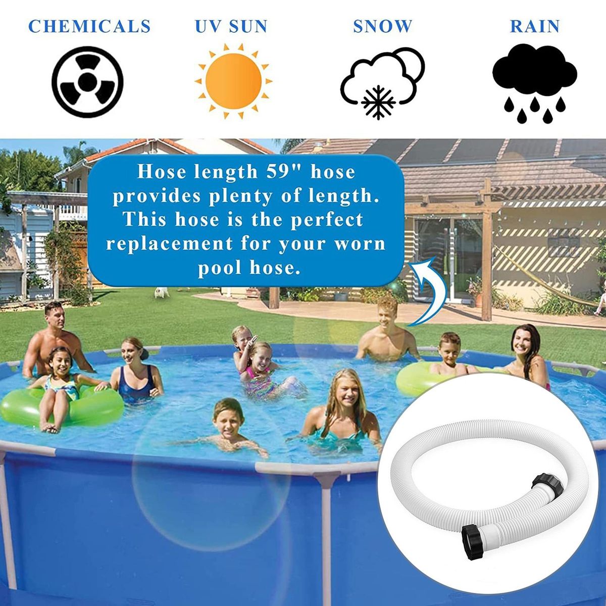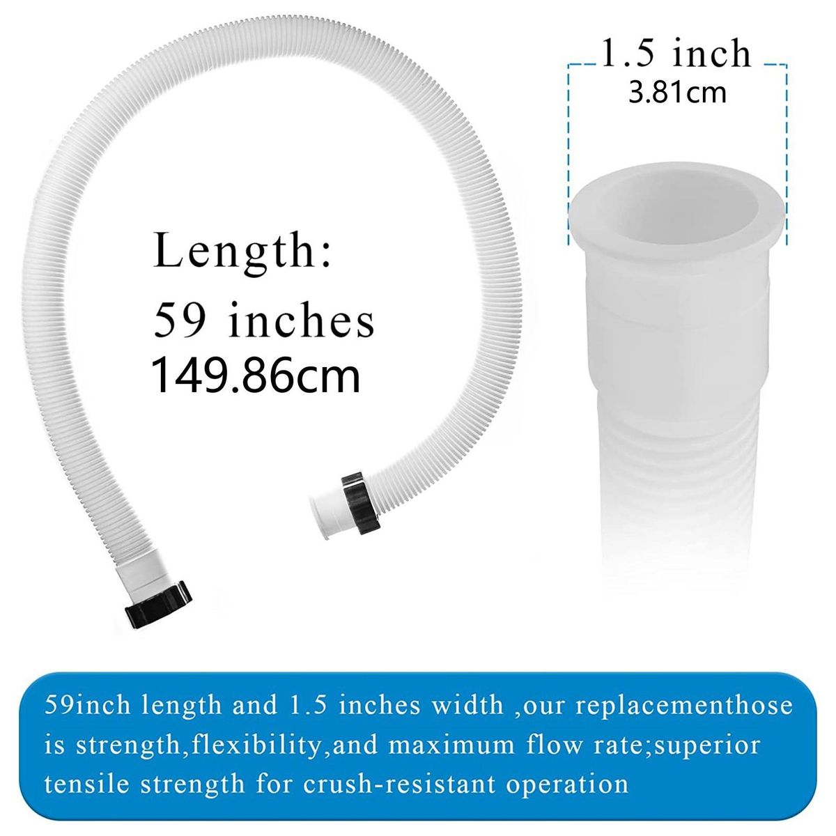 The pool hose length is 149.86cm, and the diameter is 3.81cm.