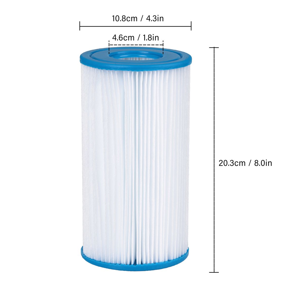 DIMENSION: With an outer diameter of 10.8cm/4.3in, an inner diameter of 4.6cm/1.8in and a height of 20.3cm/8.0in, this filter cartridge can easily fit your swimming pool pump.