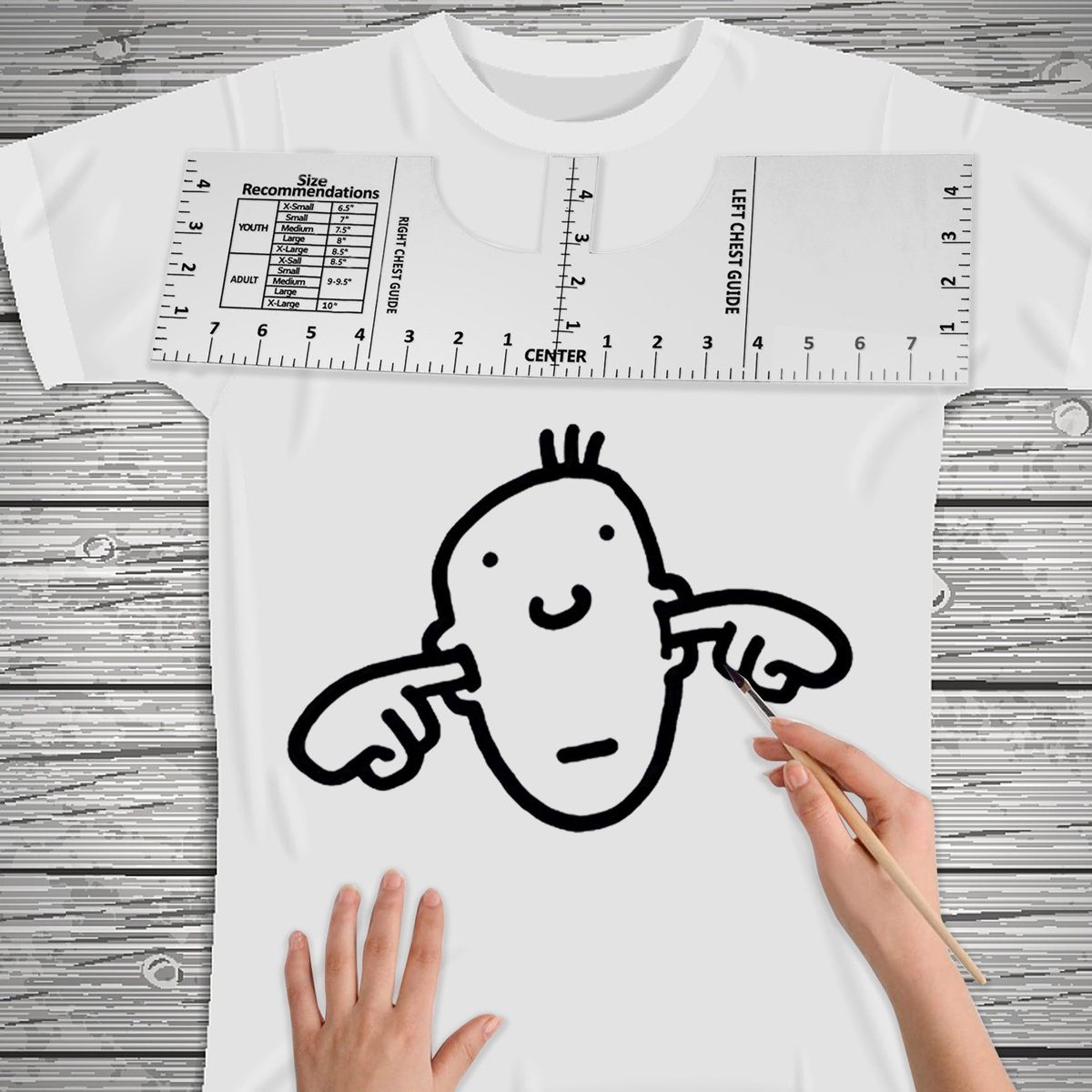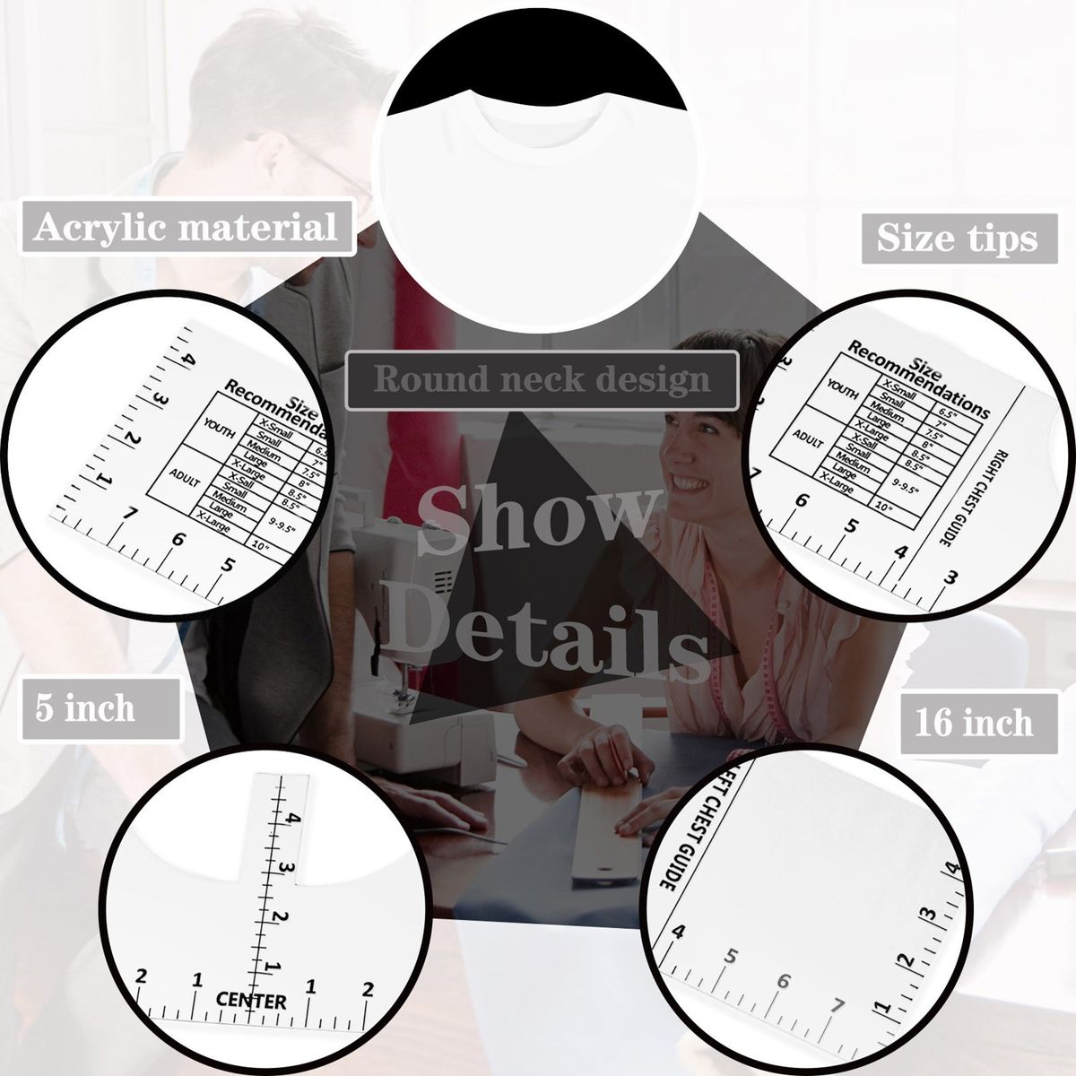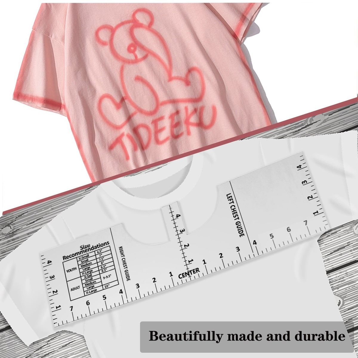 16*5in alignment ruler for measuring round neck t-shirt, with left and right chest guide for various sizes of youth and adult, convenient for using.