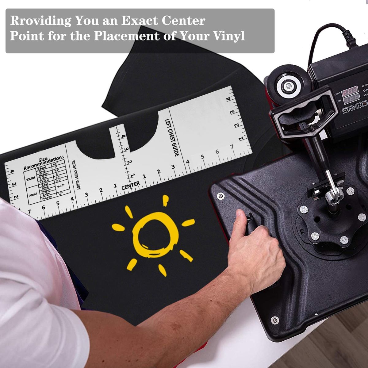 Easy to use, just line up the ruler to the collar of the t-shirt and center design before pressing.
