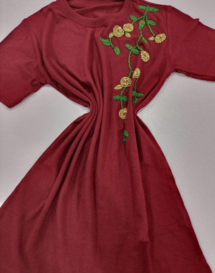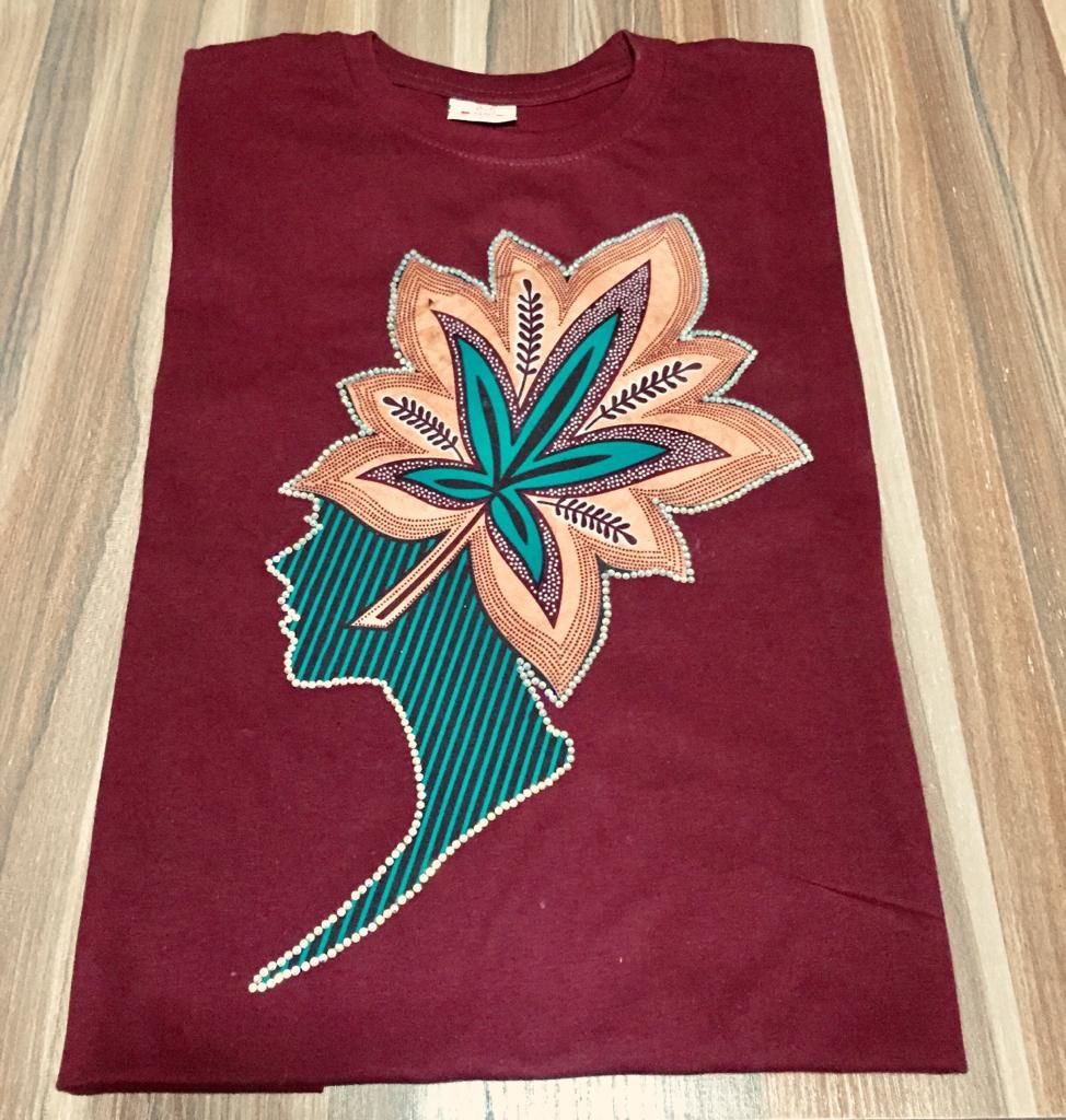 Wine t-shirt with beaded flower design. Round neck, short sleeves, quality Cotton fabric. Fully handmade design with beads and tacking stone. Great fit for you and can be use as a gift for that special someone.
