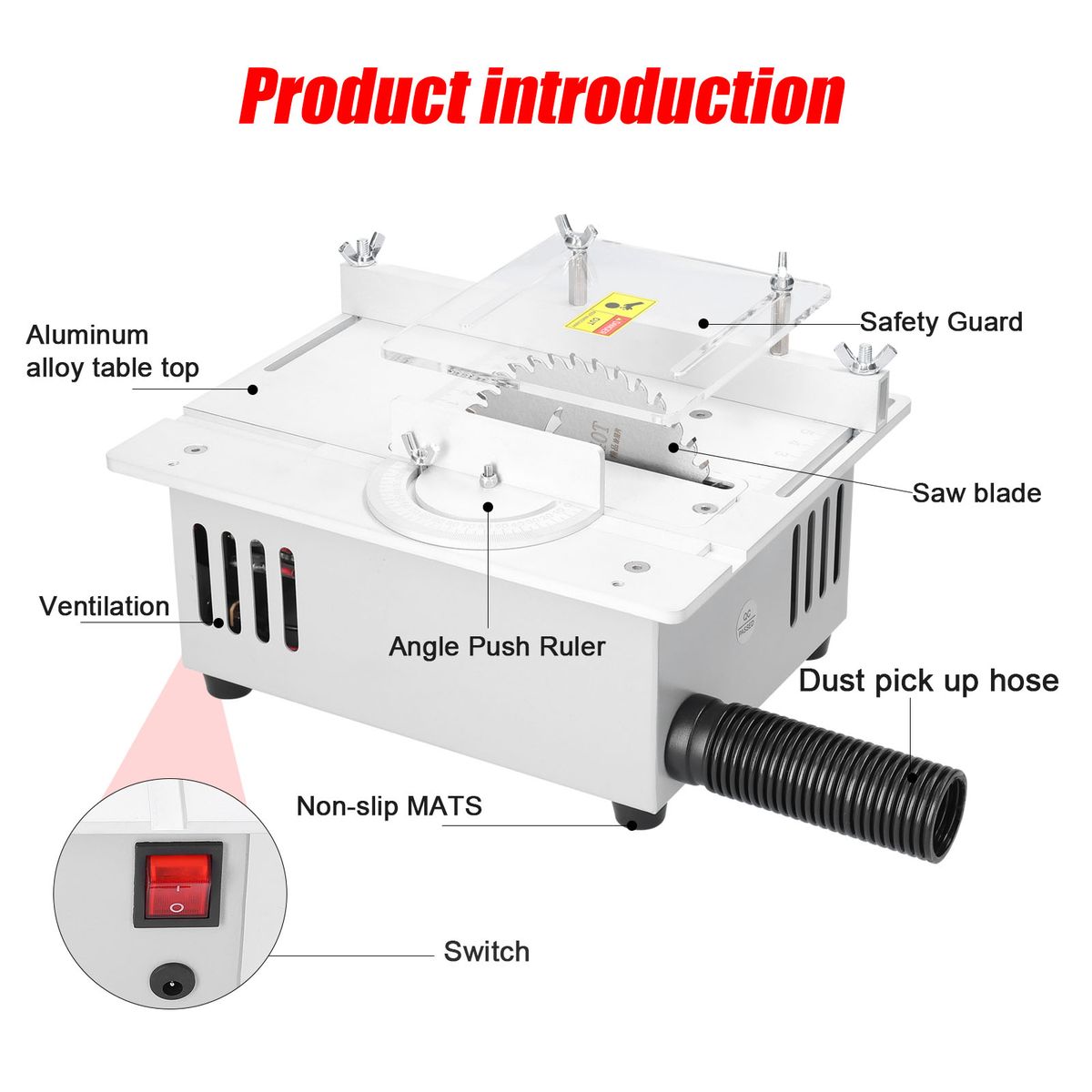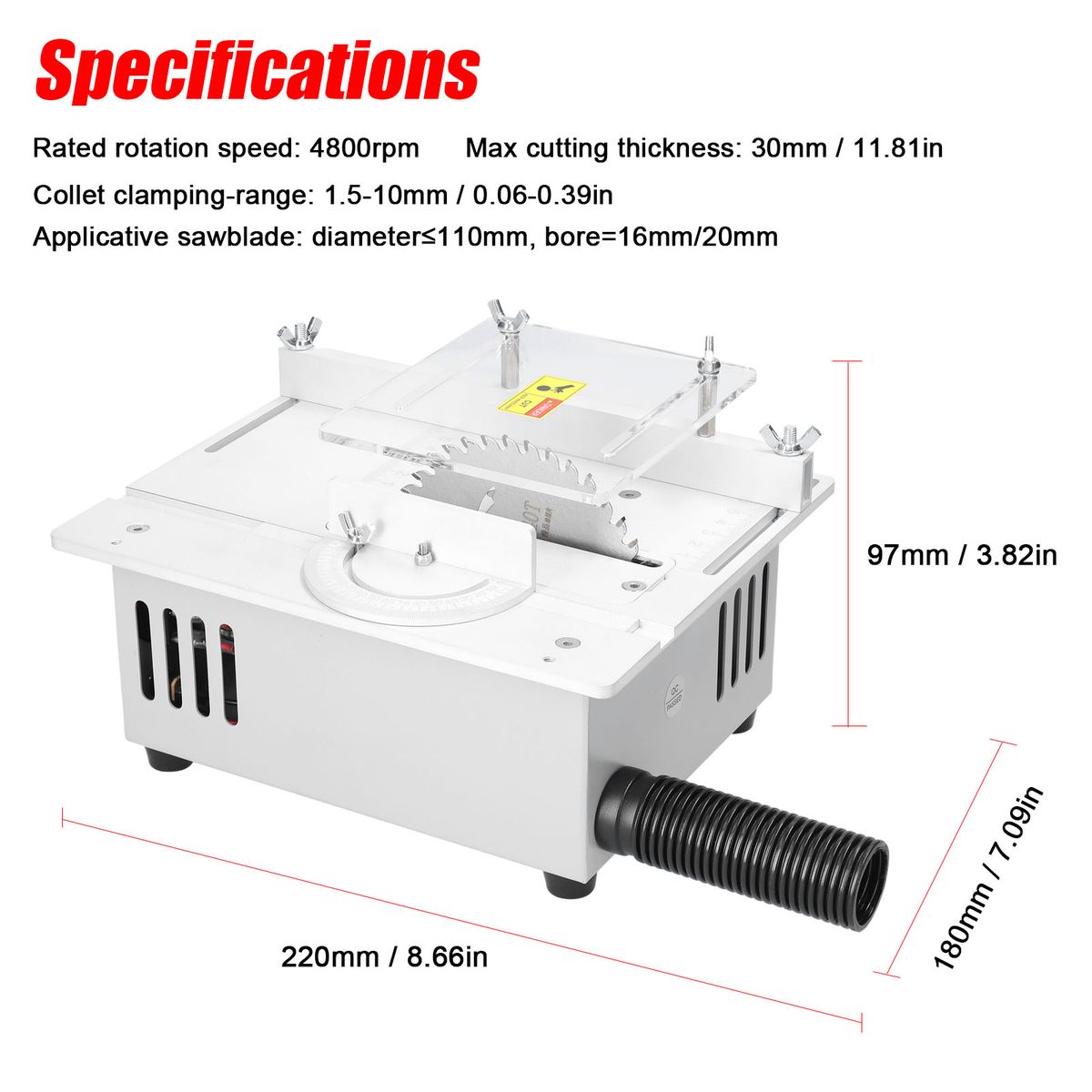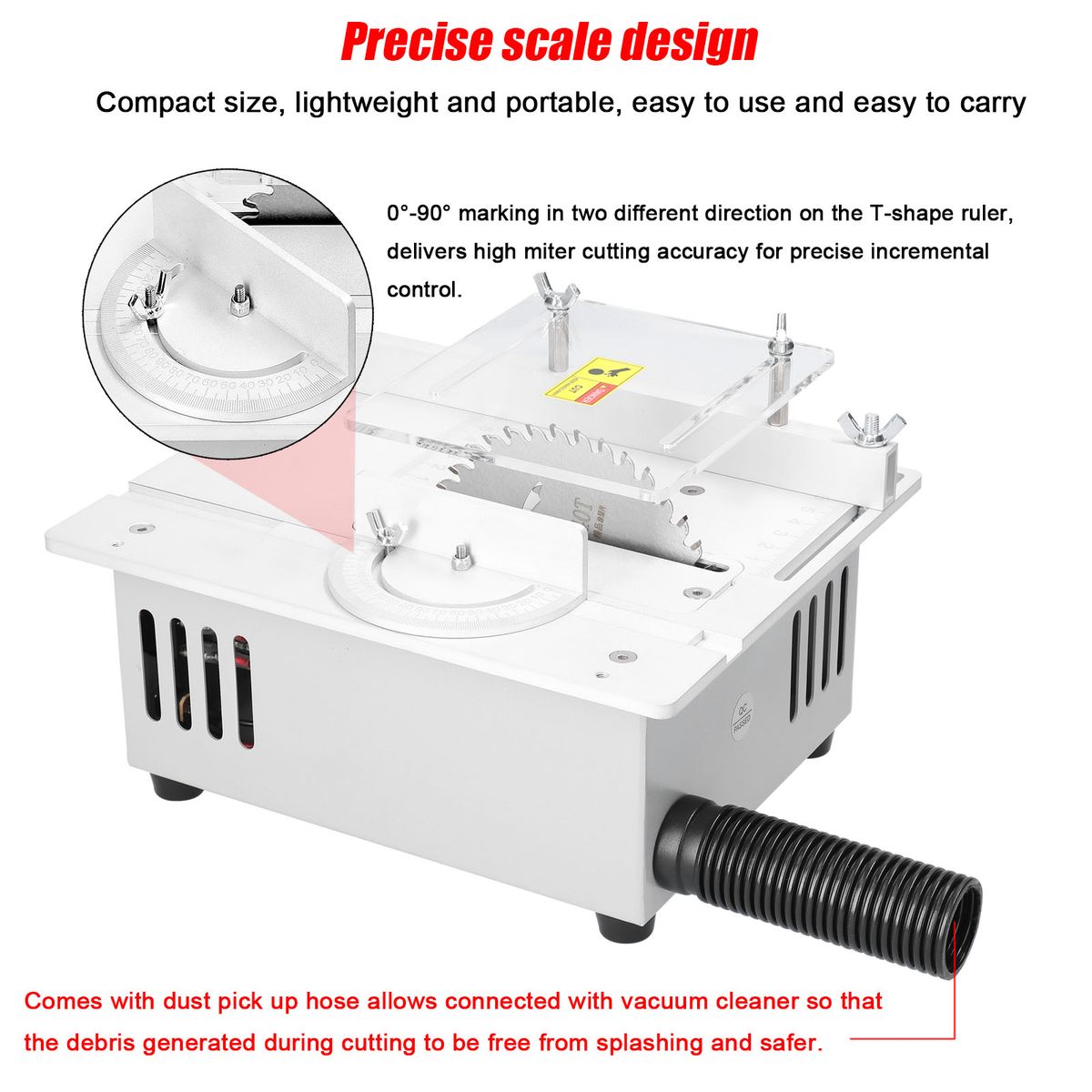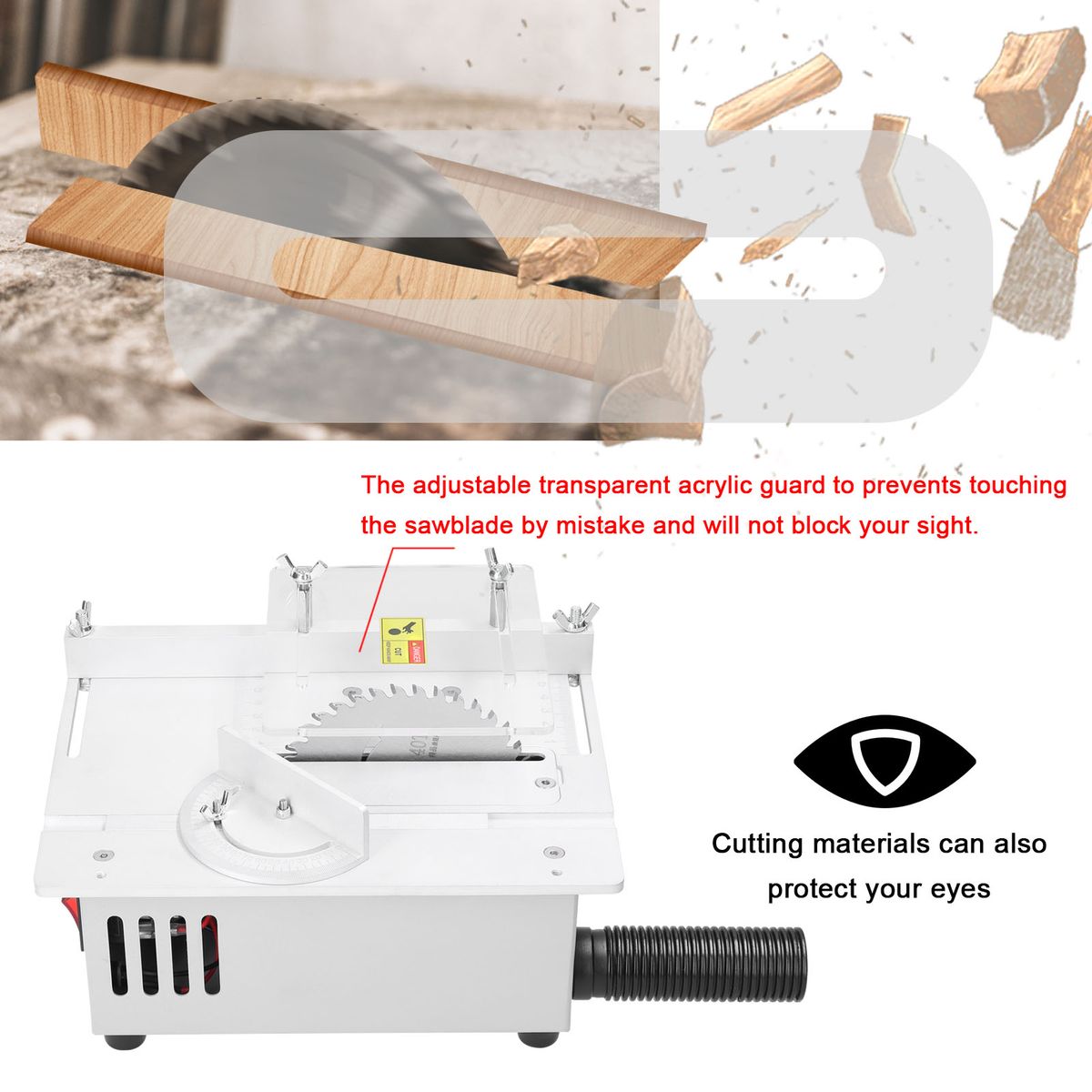 The adjustable transparent acrylic guard to prevents touching the sawblade by mistake and will not block your sight.