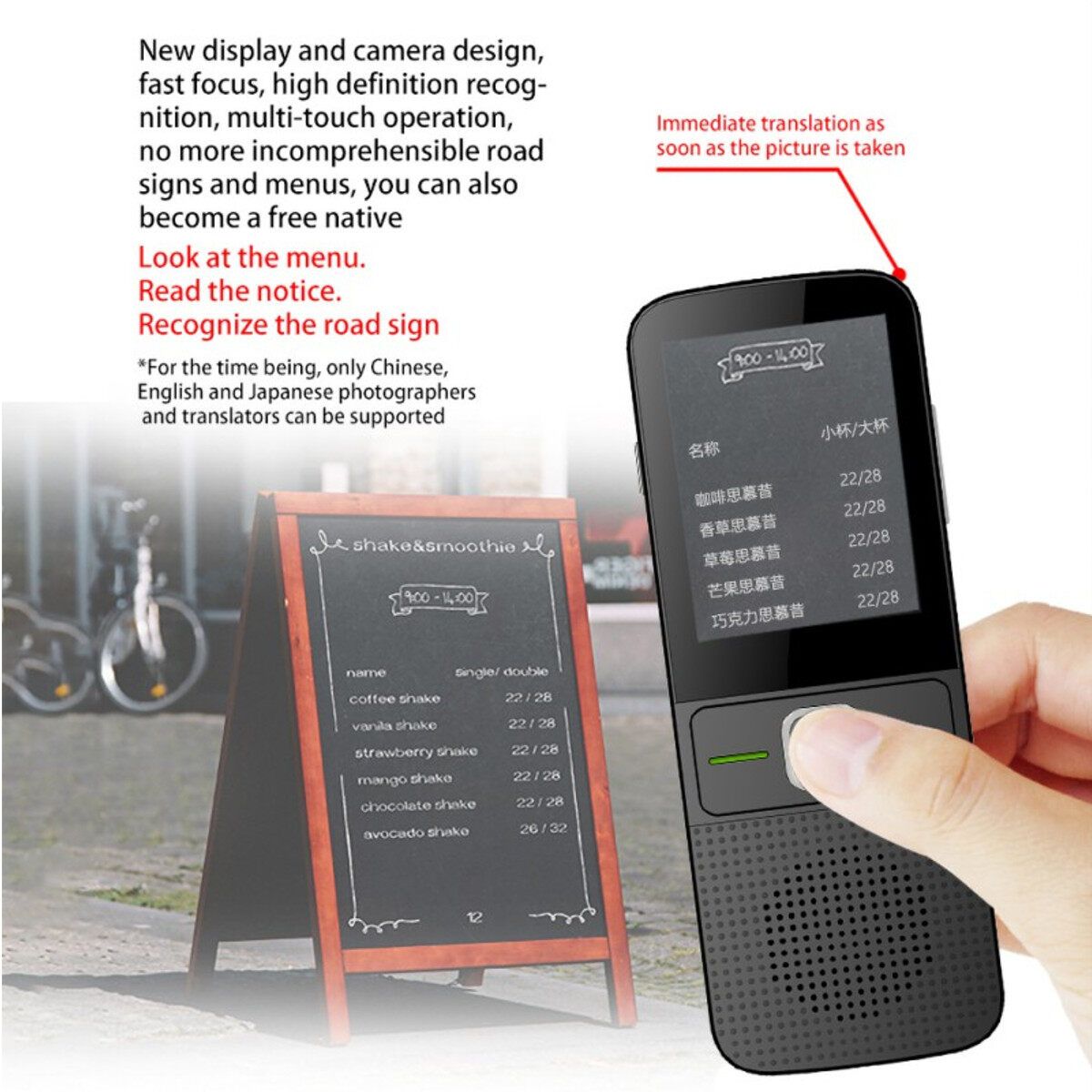 - WIFI connect or off-line translation. With display screen and camera, picture, text and voice translate, easily translate menu, guideboard and placard.