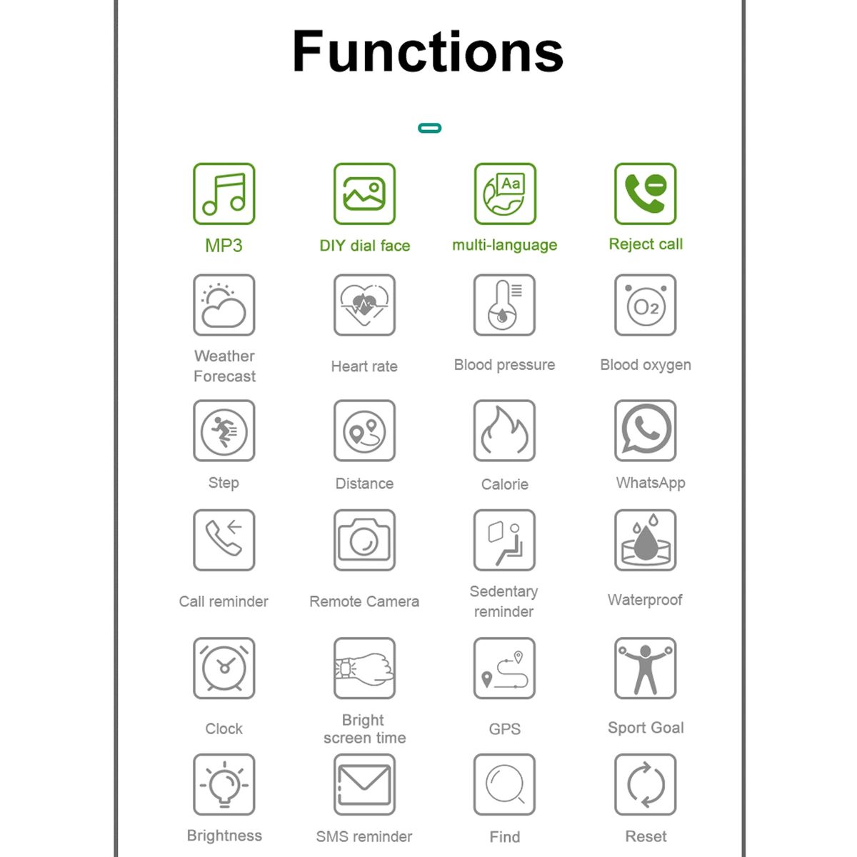 7. Function: exercise record (pedometer, calorie burn, mileage), sleep monitoring, support call reminder, SMS, WeChat, QQ push, alarm clock reminder, support remote camera, etc.