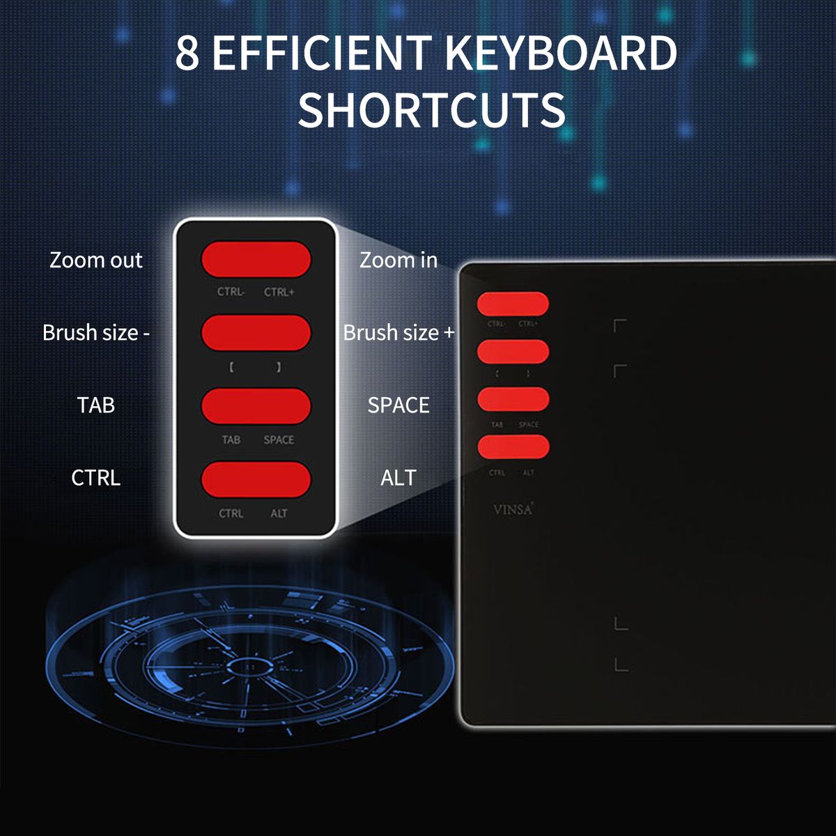 [8 Shortcut Keys] Effect to operate in the upper left corner, can zoom in/out your canvas, etc. And it can be customized in Window OS, improving the productivity and efficiency when creating with the drawing tablet.