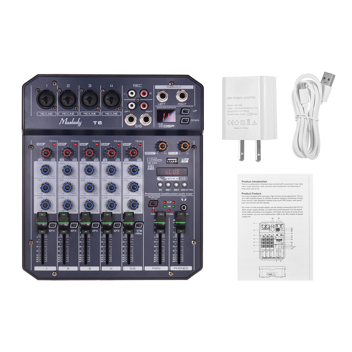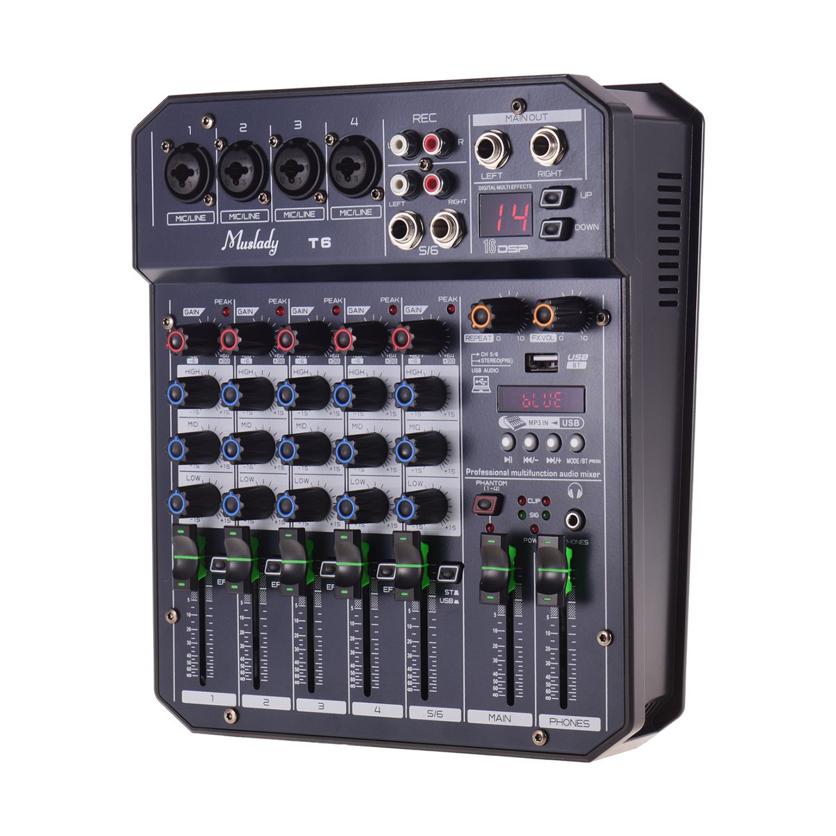 6-channel sound card mixing console with 4 XLR/TRS combined mono MIC/LINE input jacks and 2 TRS & 2 RCA stereo input jacks.