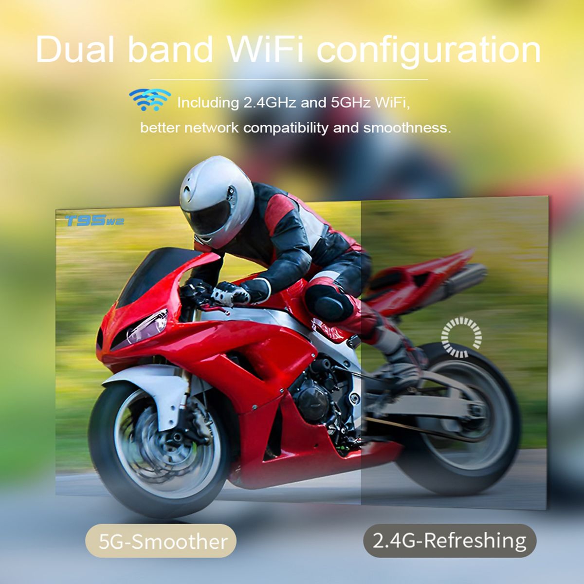 Once connected T95W2 with WiFi or RJ45, your HDTV becomes into a smart streaming machine, making home entertainment easier. Supports 2.4G/5G dual-band WiFi.