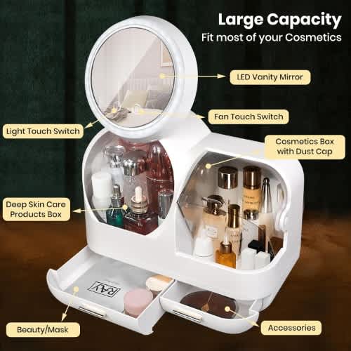 Buy Table Top Makeup Organizer 360° Rotating Mirror, Touch Control Led Lights And Fan in Nigeria