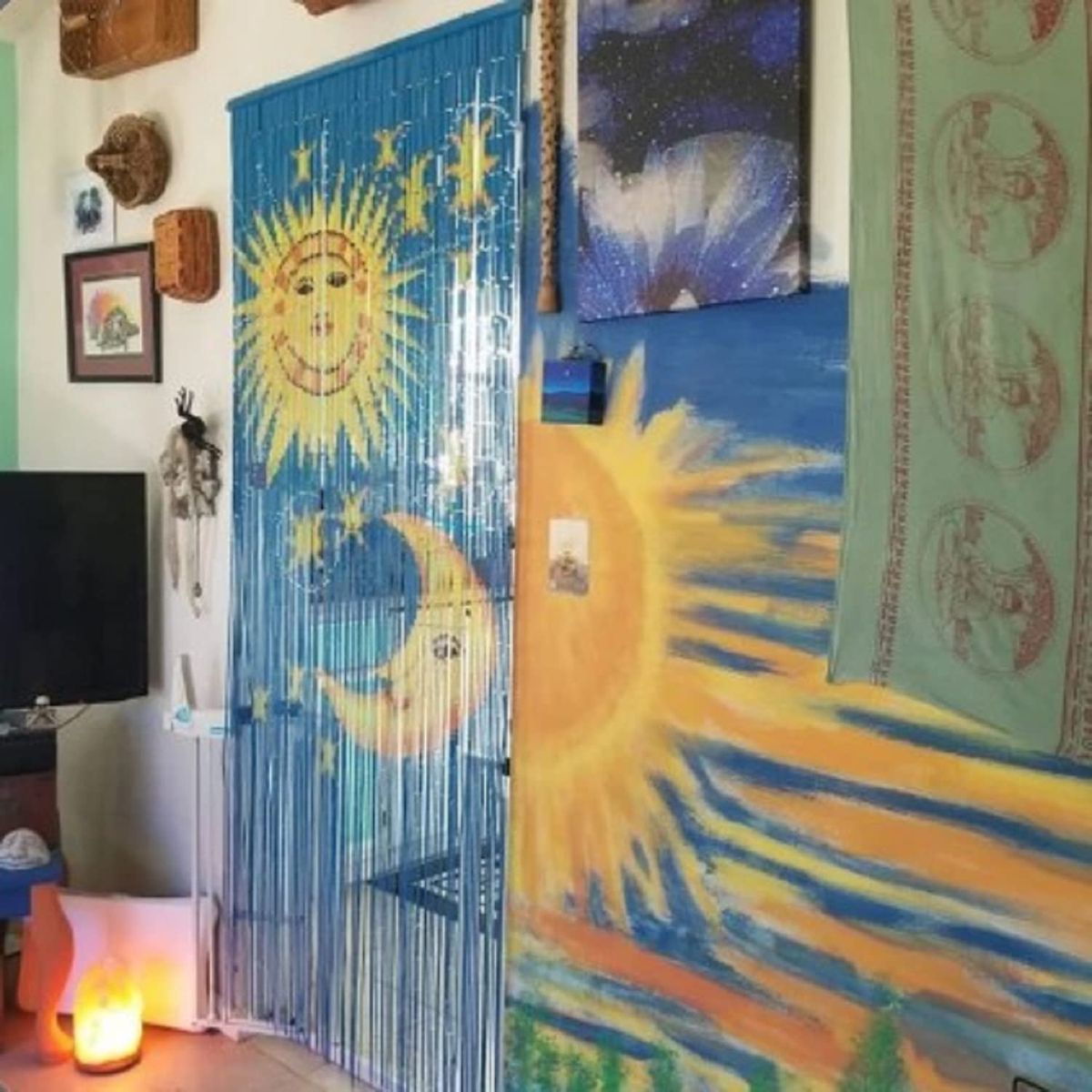 Do the beads have the same size?The bamboo beads are bigger on the top and smaller on the bottom of curtain similar to bamboo branch. | Is this curtain for privacy area?No. It does NOT provide full privacy. You canSEE THROUGHit when the lights are on but still gives little privacy when the lights are off. | It can be used as a dividerIt can be used as adividerfor your teenagers room or from bathroom to the main bedroom or between the kitchen and laundry room… | Use as doorway decoration or artThe image is hand painted and visable from both sides of the curtain and at any angle. It looks great if you use it againts a wall as a piece of art or door decor. |