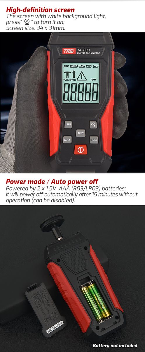 TA500 series digital tachometer that can measure the RPM or surface speed and distance. It is applicable to electric , steel, petrochemical, aviation, fan manufacturing, pipeline ventilation system, underground warehouse and other occasions.