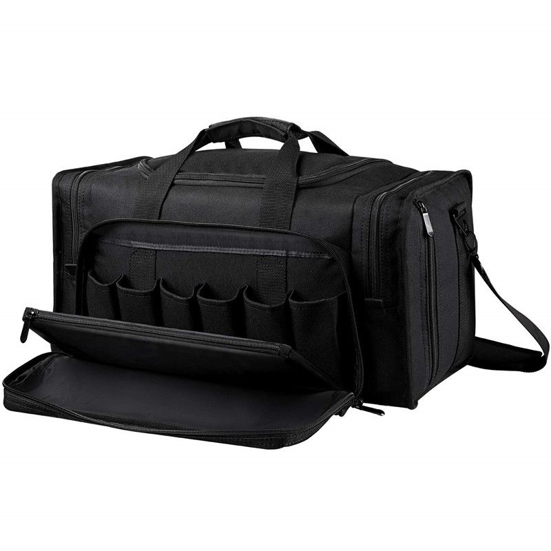 Center compartment has ample room for carrying hand guns, extra ammo, gun cleaning supplies, and magazine loaders. The removable dividers and zippered es provide additional versatility. Side pockets are large enough to handle your ear phone protection. Front and back pockets hold 12 magazines securly, plus has space for tools for the range. Real nice bag. You could easily carry two guns in the gun carrying bag. Can carry multiple s, magazines, ammo, earguards, everything you need for the range. Very sturdy and well made. It would be difficult to find a comparable range bag at these money.