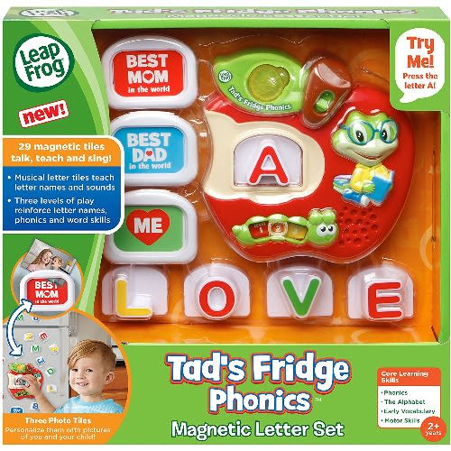 Make learning the alphabet exciting with Tad's Fridge Phonics! This interactive toy introduces your child to the letters of the alphabet and the sounds they make, helps build vocabulary and exercises fine motor skills. Place one of the 26 musical letter tiles into the letter slot and press down for three modes of play that reinforce letter names, phonics and word skills. Three frames can be customized with your own photos and images, for a unique, personalized play experience. With its magnetic base, it's great for fridge play in the kitchen.