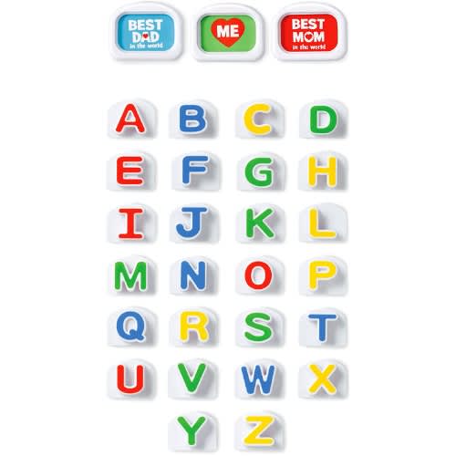 - 26 magnetic letter tiles stick to the fridge and help kids learn the shape of each letter