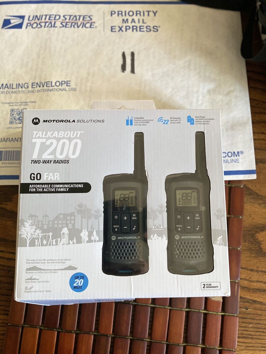 The Motorola Talkabout T200 Walkie Talkie Set features 2-way radio technology and a max range of up to 20 miles. Each handset is incredibly light for easy, continuous use, and it can scan channels for activity. When the handsets are idle, they take advantage of an Eco Smart feature that uses less energy. There are 22 total channels this system can access along with more than 120 privacy codes. When using a rechargeable battery pack, the system offers up to 12 hours of use per handset.