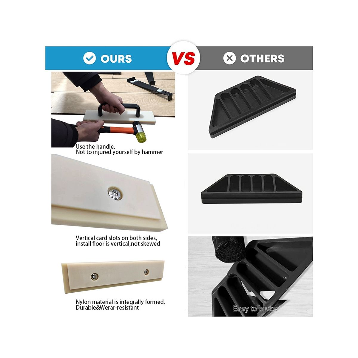 [No Damage to Floor]Built-in screw, it will not hurt the floor. Simply place against the edge of a laminate or hardwood flooring plank, then tap with a mallet for tight floorboards.