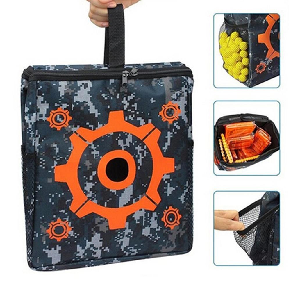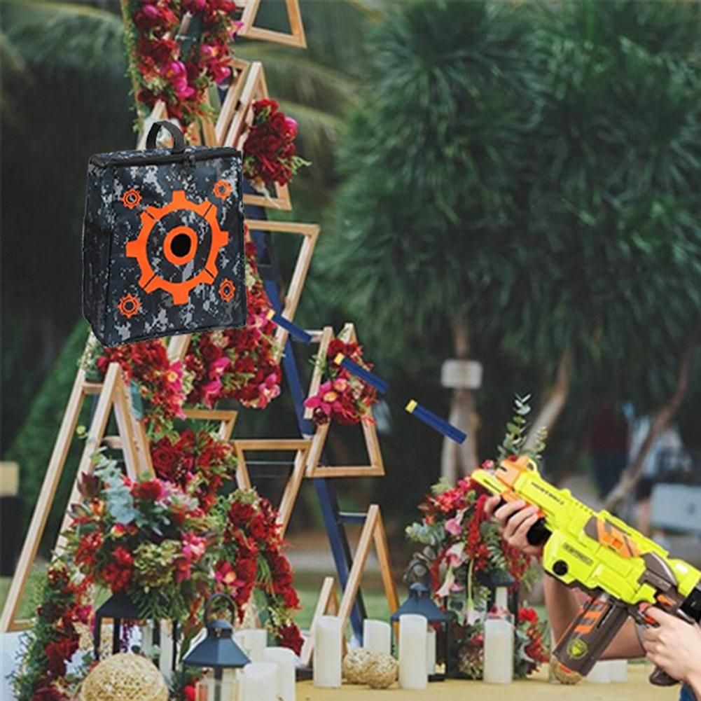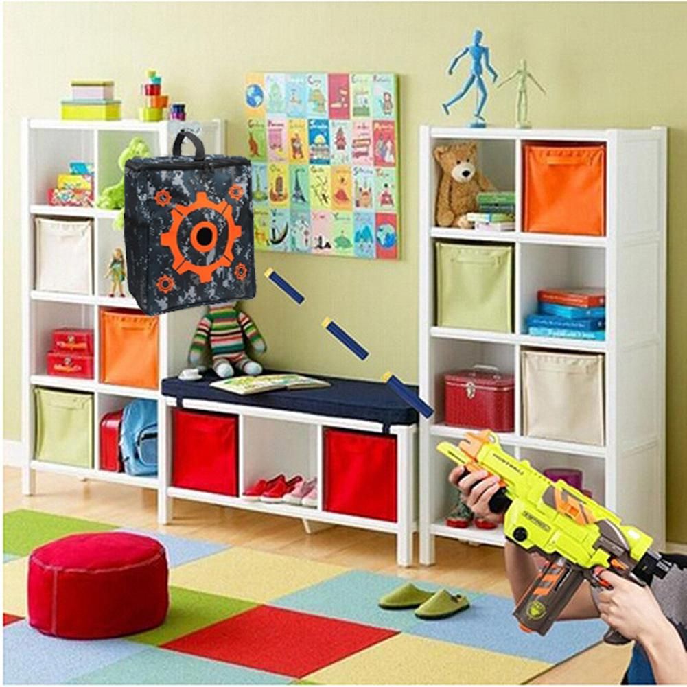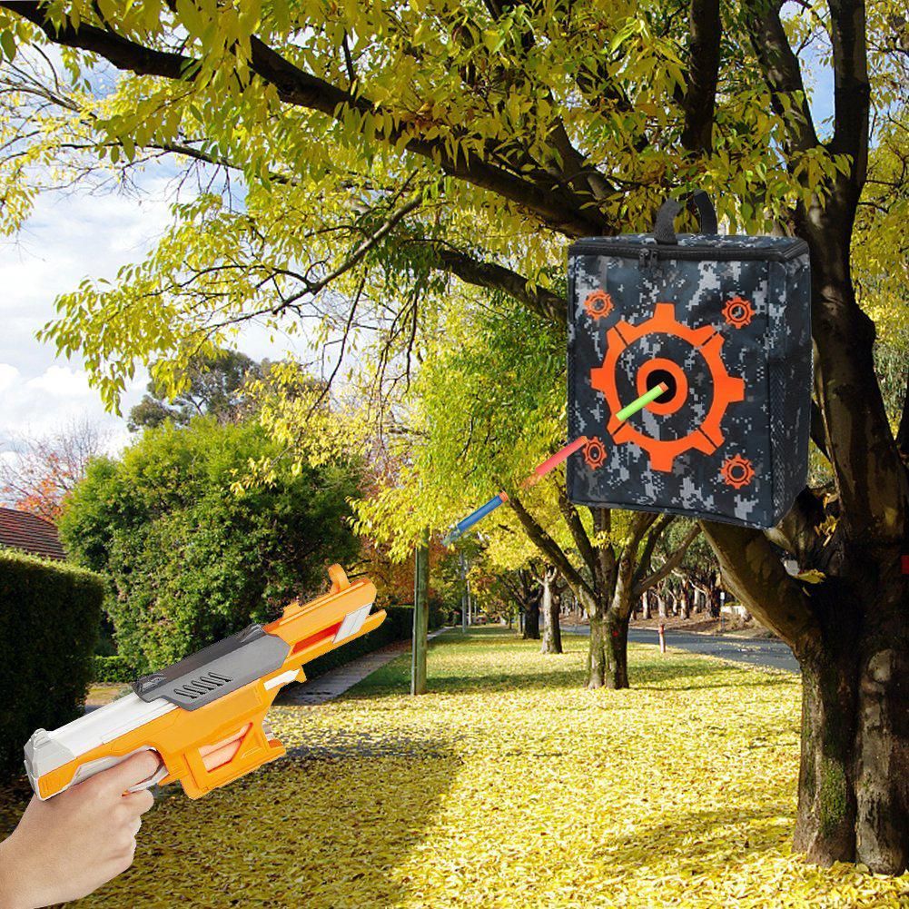 3.Easy to Sort Out: There must be a mess after a Nerf gun war. Now with the target storage bag, you can put all stuffs in it. Large enough to hold guns, darts, glasses. Portable and easy to carry with the handle. You can also hang the target bag make it into a perfect shooting target, improving your shooting skills.