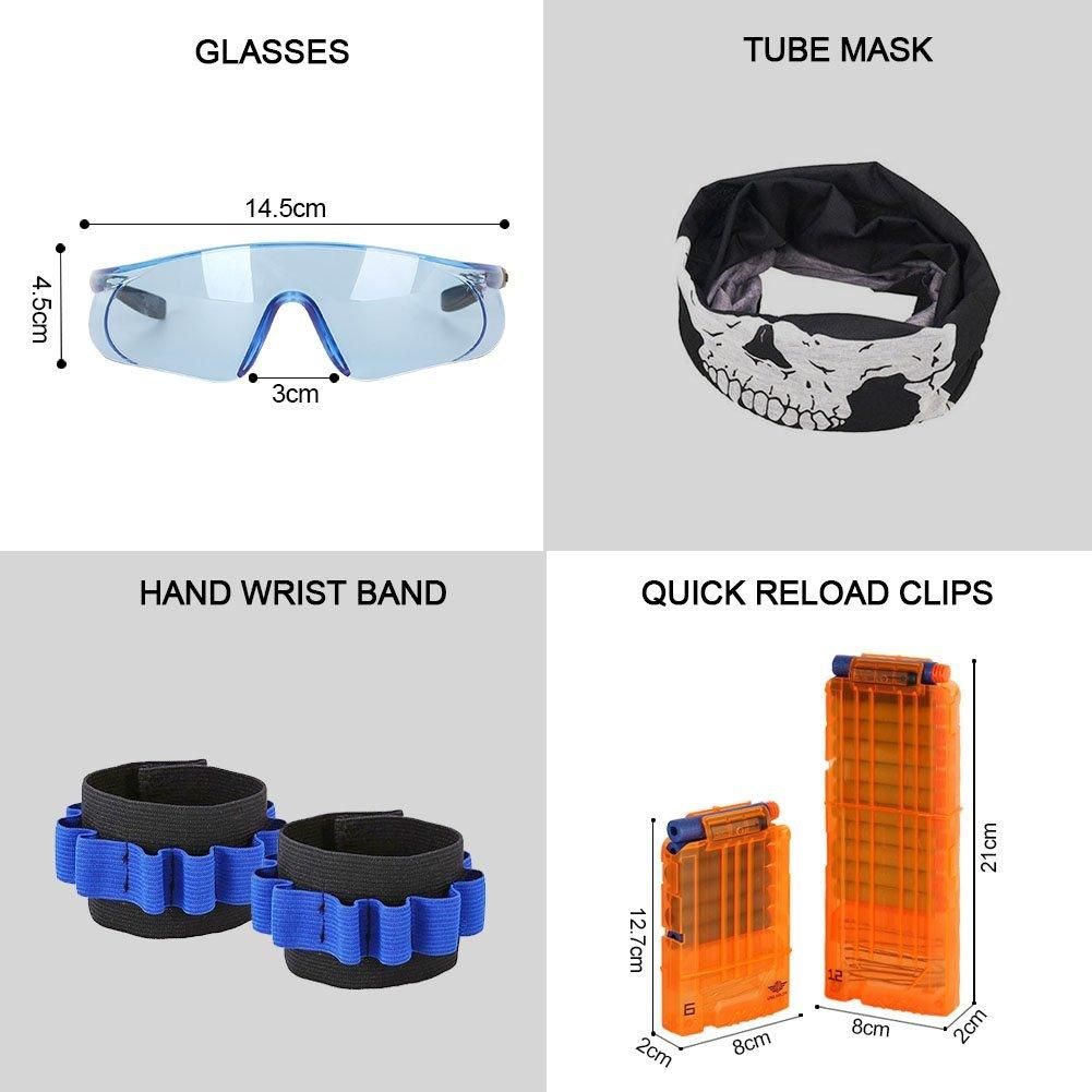 4.Armed to the teeth: Order this Nerf gun kit now, you will get the protective glasses for eyes, tube mask for head, hand wrist for arm, shoulder bullet strap for shoulder, and a waist bag for leg. An invincible Nerf gun warrior is coming!
