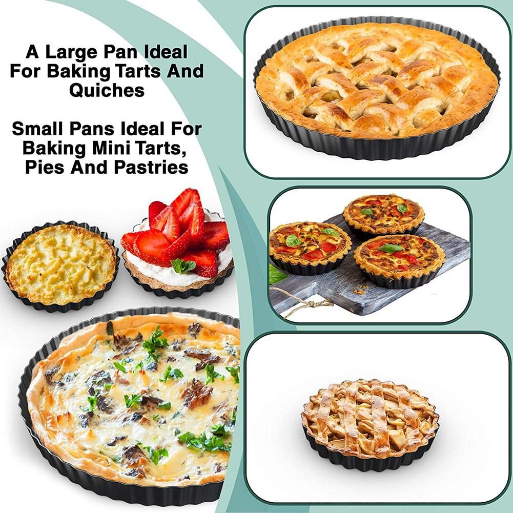 Tart Pan and Quiche Pan - for Baking Pies,Exactly What You Need: Looking for perfect pans set to serve your family and friends? Look no further than Tart Pans set to make baking hassle-free. This Set of 5 includes one 9-Inch tart pan and four packs of 4-inch mini tart pans. Tart pans are perfect for birthdays, celebrations, and other festivities, equally great for quiche, tart, pizza, pie, and cake making.