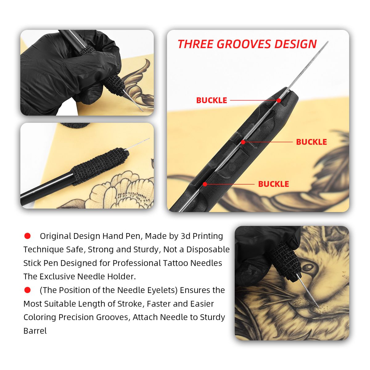 It comes with hand poke tattoo pen, needle grommets and assorted tattoo needles.