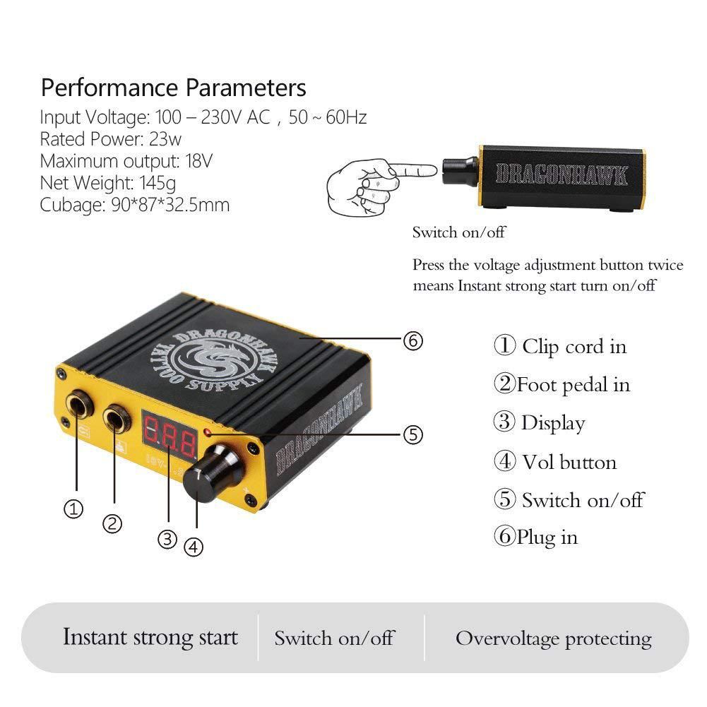 " " This machine features a powerful motor and an advanced gear system that guarantees reliable, quiet operation without any vibration RCA cord connection and included with purchase. " " Working voltage of 6 to 9V, Speed: 9000r per m,Weight:140g ,more portable and flexible to be operated. This machine could be used both shading, lining, large area coloring. " " This rotary tattoo machine has an extremely smooth design, there is virtually no vibration, and it runs very quietly. " " Power Supply Net Weight: 145gram. 90*87*32.5mm, overvoltage protecting. Anti-fatigue mode. " " 100% E.O Gas Sterilized and individually packaged. Light clear colors tip body. Better visibility. Mag curved tip at the end for easier cornering.Low profile housing & better ink flow & shaped on the inside.Needles made of 316 medical grade stainless steel. " " The Dragonhawk Mast tattoo machine is compatible with all needles type " " Package Including: " " 1 Pcs Rotary tattoo machine pen with RCA cord " "1 Pcs Power supply " "20 Pcs Tattoo Needles " "1Pcs Foot pedal " "1 Roll bandage " "1 pcs Professional tattoo box