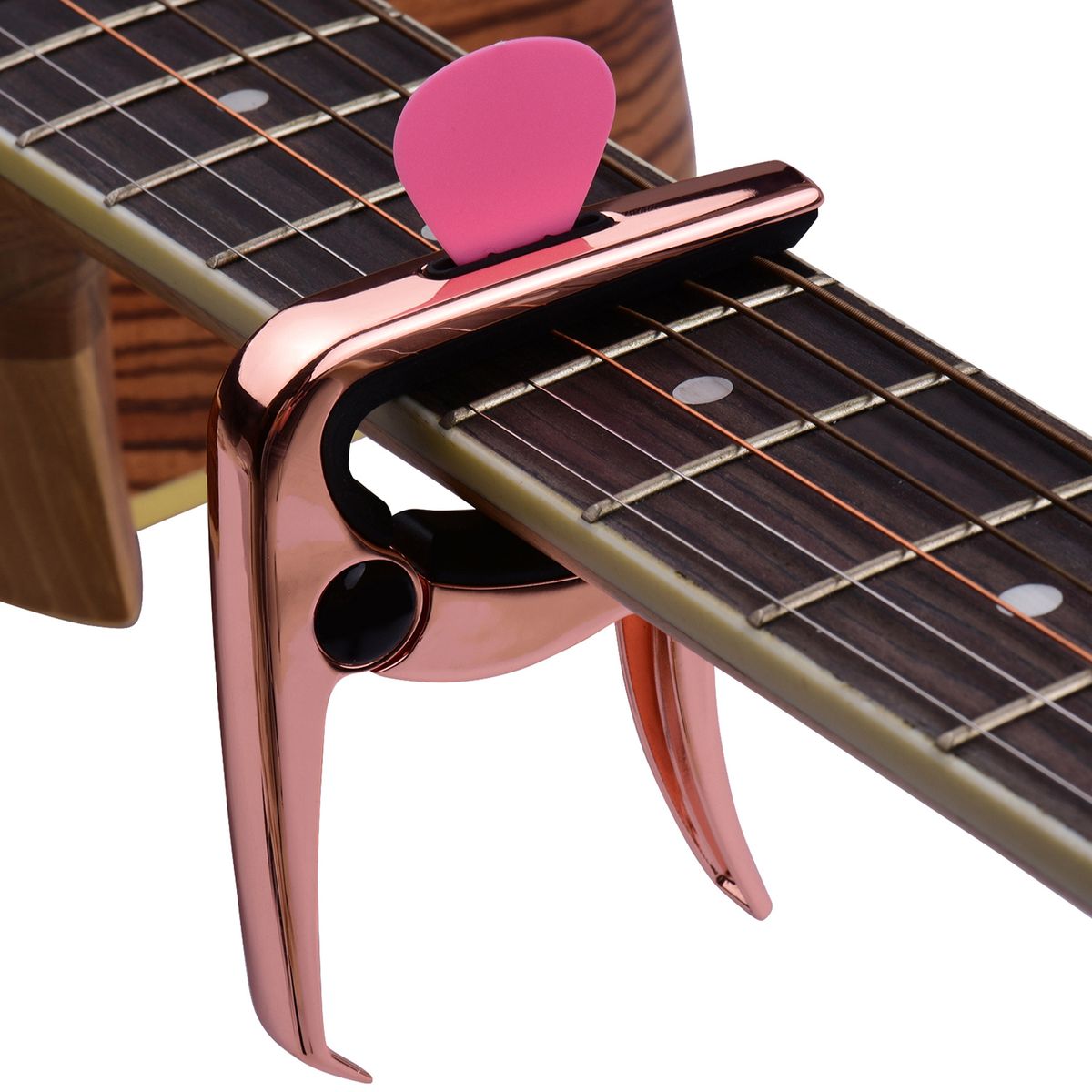 With a slot on the top of guitar capo, you can put one guitar pick in it; and comes with 3pcs guitar picks