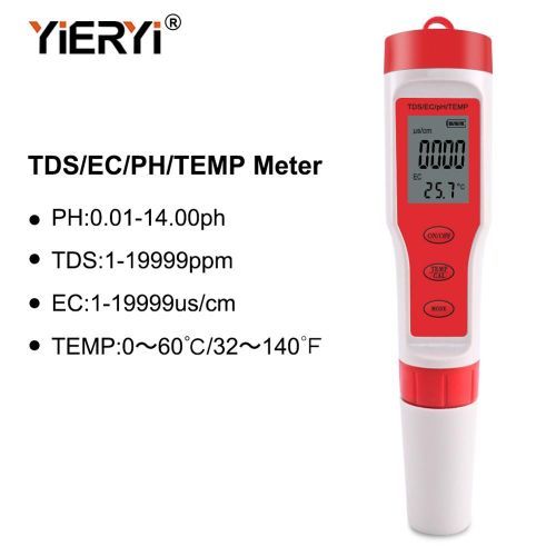 ► Measuring range: pH:0.00-14.00pH; TDS: 0-19990ppm; EC: 0-19990muS/cm ► Resolution: 0.01 pH; 1ppm; 1muS/cm; 0.1℃; 0.1degF ► Accuracy: pH: +/-0.01 pH; TDS/EC: +/-2%; Temp: 0.5℃ ► Batteries: 3 * 1.5V LR44 button cell (not included) ►Temp.: 0.1-60.0℃; 32.0-140.0degF ►Calibration: pH: three points automatic calibration (6.86 & 4.00 & 9.18pH); TDS: 1413muS/cm; EC: 1413muS/cm ►Auto shut off: 5 Minutes