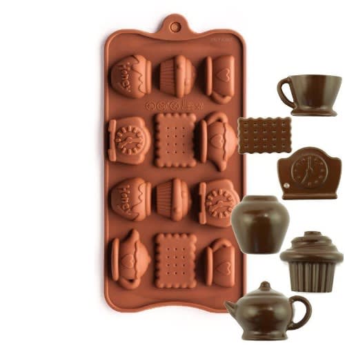To use, melt your chocolate and pour into the mould cavities. Tap the mould to release any air bubbles. Using a scraper, remove the excess chocolate off of the mould and place in the refrigerator until set. To remove the chocolates from the mould, bend the silicone and pop out the chocolates.