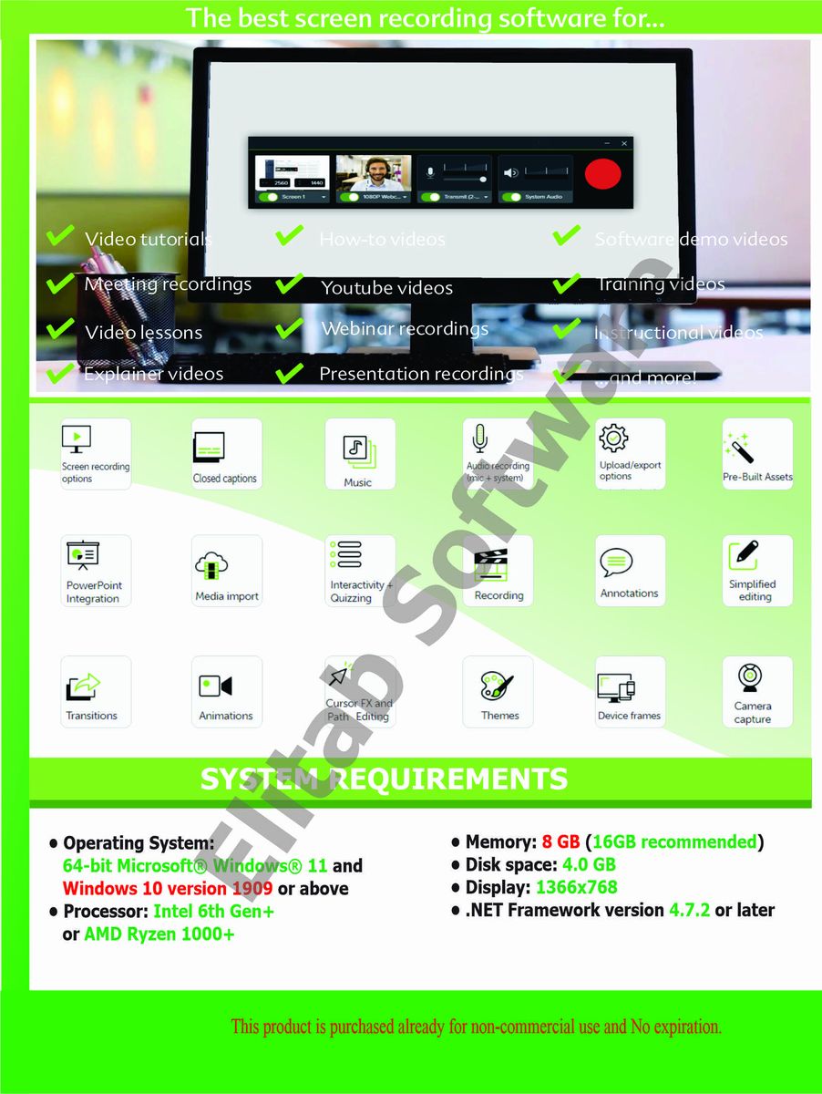 The Best All-In-One. Screen Recorder and Video Editor. Camtasia 2021 makes it simple to record and create professional-looking videos. Camtasia 2022's new video templates make it easier than ever to create the video you need.