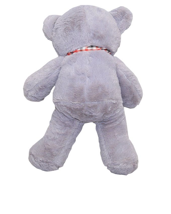 Purple teddy bear. It has a tie made with check material of red, white and black round its neck