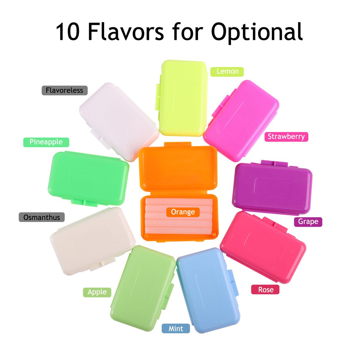 Box Color and flavor: White(flavoreless), Purple(grape), Orange(orange), Green(pineapple), Blue(mint), Yellow(lemon), Light Yellow(osmanthus fragrans), Rose Red(rose), Red(strawberry), Light Green(switch) (Optional)