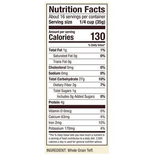 Whole Grain Teff, an ancient East African cereal grass, is a nutritional powerhouse. It is the smallest grain in the world—about 100 grains of teff are the size of a single kernel of wheat! Compared to other grains, it has a much larger percentage of bran and germ so it's a very good source of dietary fiber, protein, iron, amino acids, vitamin C and calcium. Another teff flour benefit is the calcium content that significantly surpasses that of all other grains.