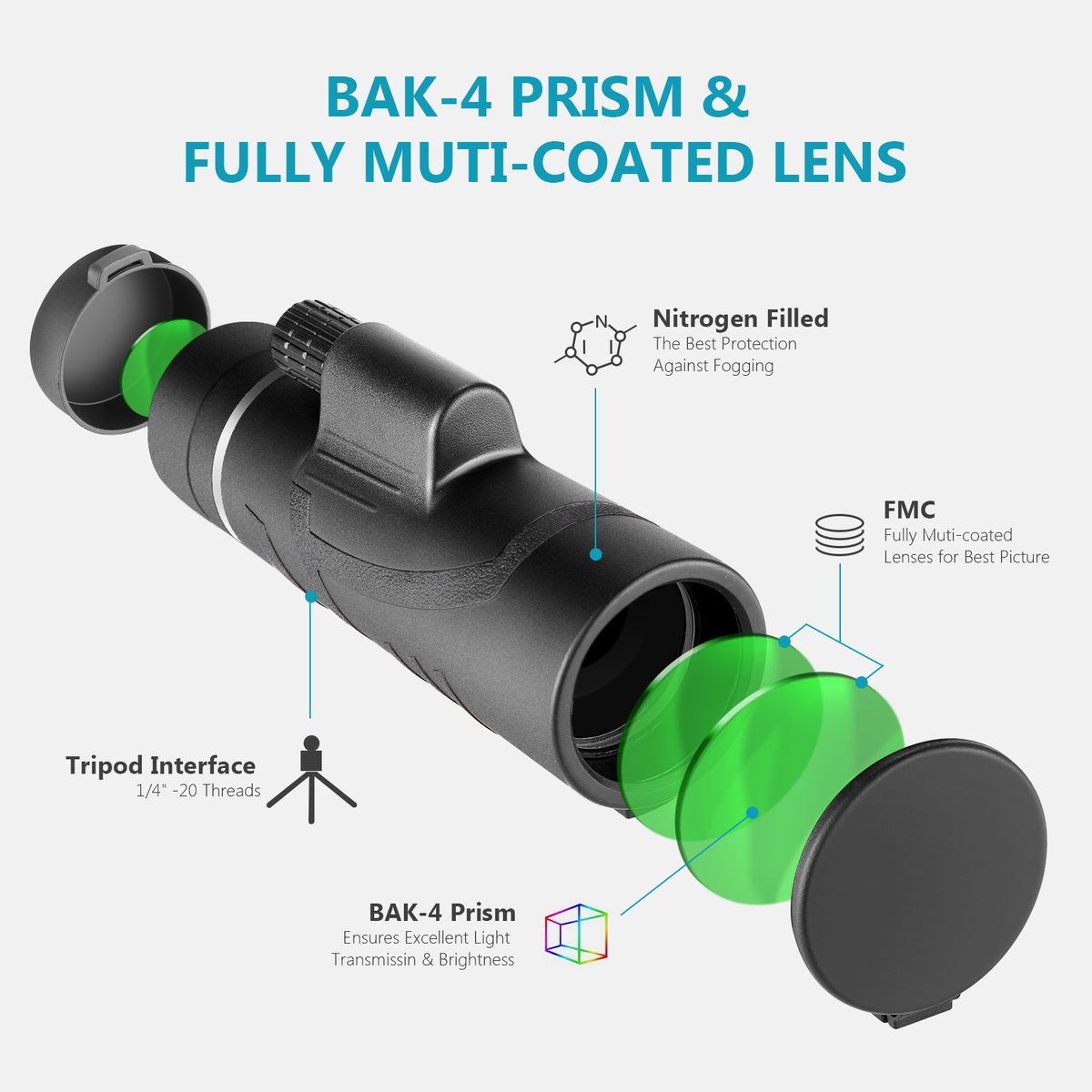 It comprises of high quality electronics and optics. It utilizes the 50mm FMC green film objective lens and BAK4 prism, providing outstanding image quality. It enable you observe target in totally dark condition. You can enjoy the beauty of the distance with large field of view (360ft/1000Yds). During the day or low light, observation distance is infinite.