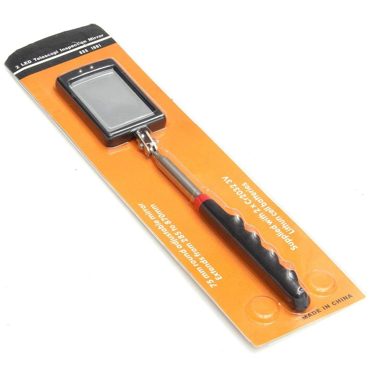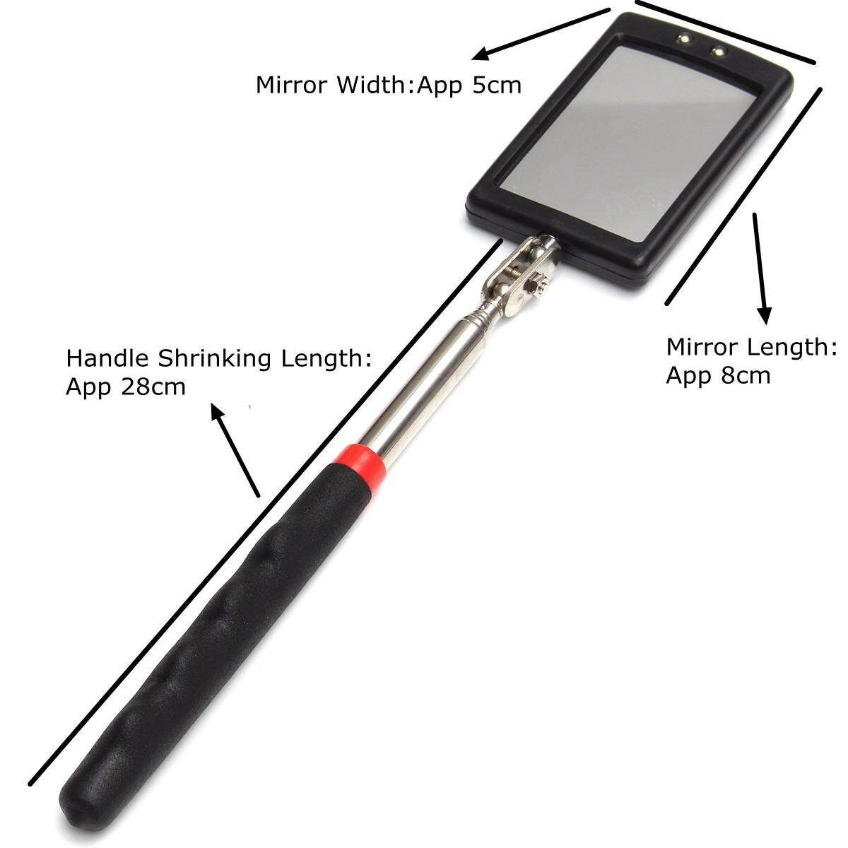Descriptions:Brand:100%NewColor:BlackSize:HandleShrinkingLength:App28cmHandleExtendingLength:App88cmMirrorSize:App8(L)*5(W)cmAnti-skidHandleLength:App12cmPacking size:App 25(L)*9(W)cmWeight:App95gPackage:1xTelescopicInspectionLEDMirror(With23VButtonBatteries)Feature:Idealforinspectingtight,hardtoreachareas.Themirroritselfisshatterresistantglass.Themirrorheadcanswivel360°duetoballbearingjoints,aswellaschangingtheangleofthemirror.Thehandleismadefromstainlesssteeltubingwithacushiongriphandle.Themirrorcomesreadytousewithbatteriesincluded.Lightandsmall,easytocarryinyourbag.Itcanextendthestickto88cm,andletyoucheckmoreeasy.WithLEDlight,moreeasytocheckthecarandmoreclear.