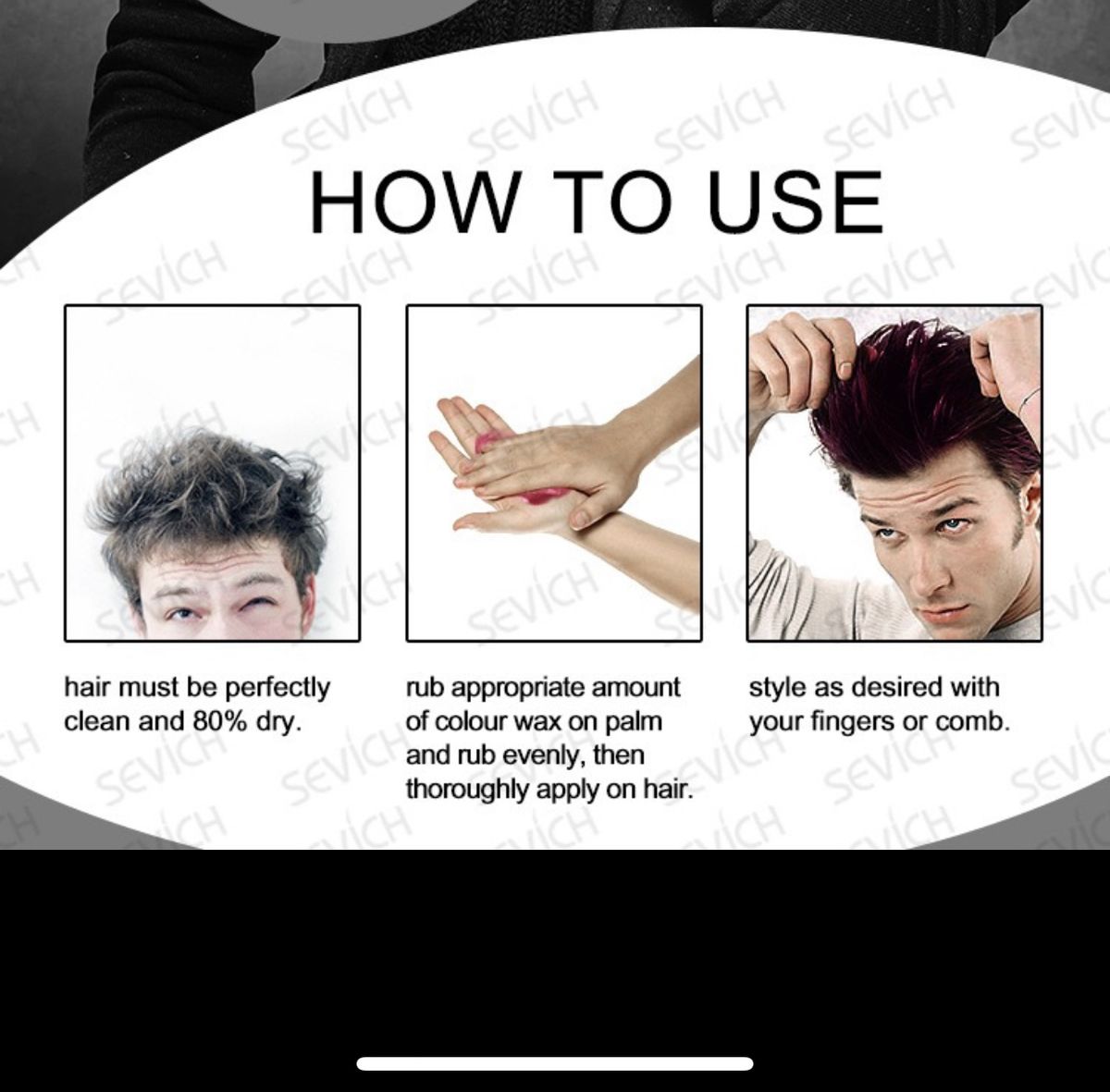 - SEVICH TEMPORARY HAIR COLOR WAX is anti-hair breakage please can be used on all occasions, it works on all kinds of skin and colors of hair for UNISEX. Sevich Hair Color Wax is suitable for natural or permed hair and for wigs or braids to build a Low-shine style with the color you like, nonsticky or greasy.