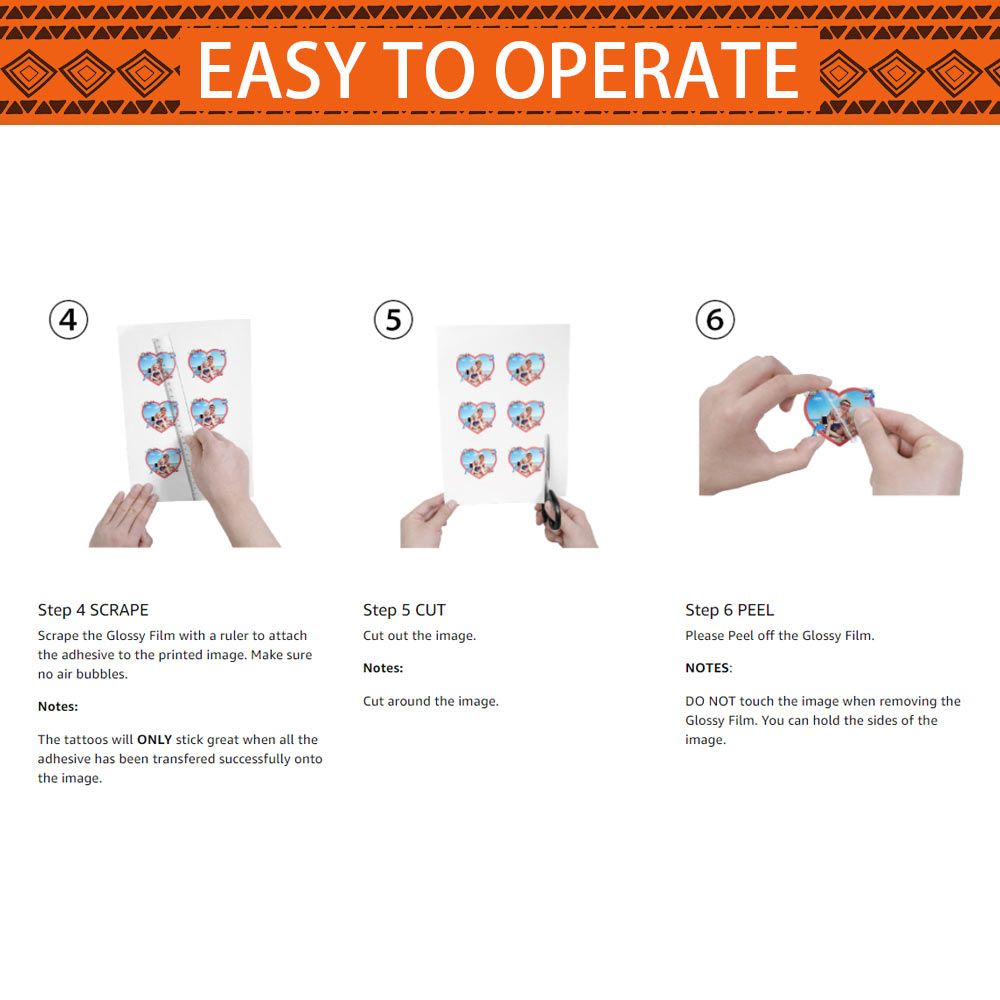NOTES: Be sure to peel off the Glossy Film before transfer the tattoo onto the skin.