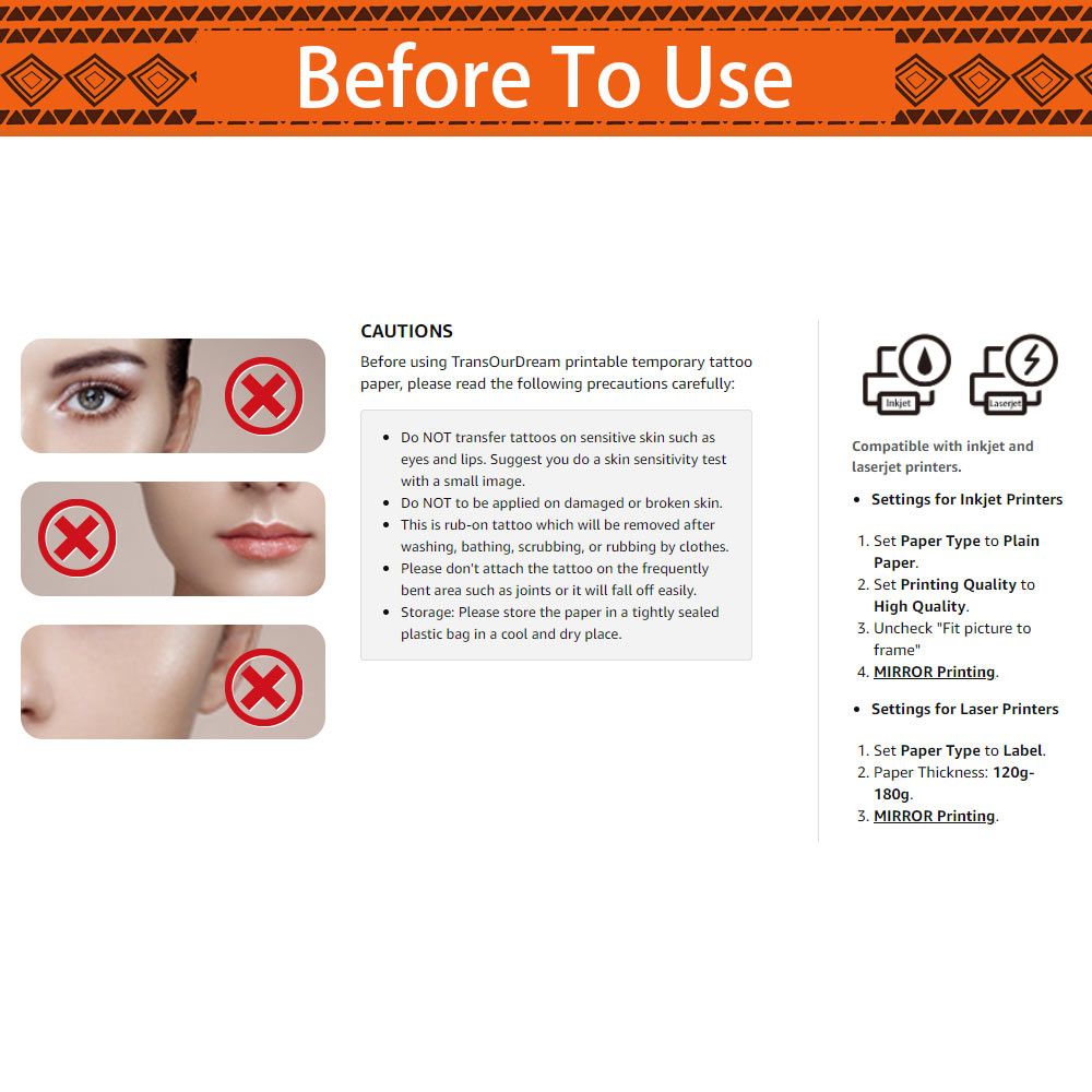 1.Before using WinnerTransfer printable temporary tattoo paper, please read the following precautions carefully: