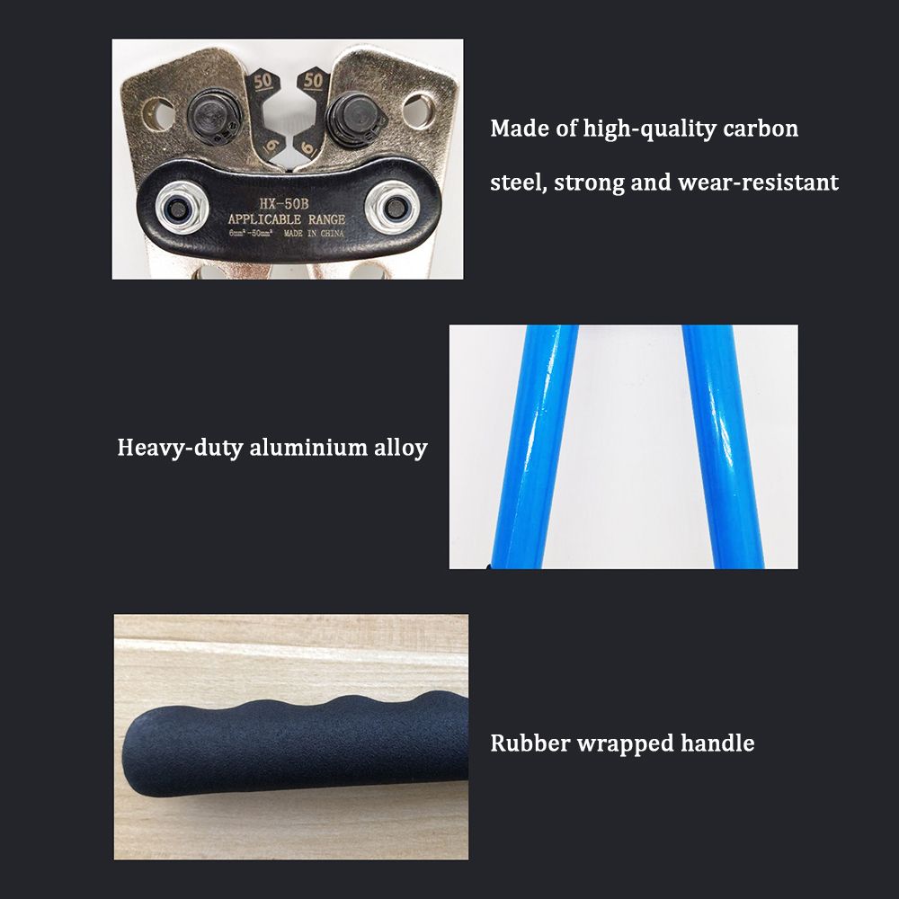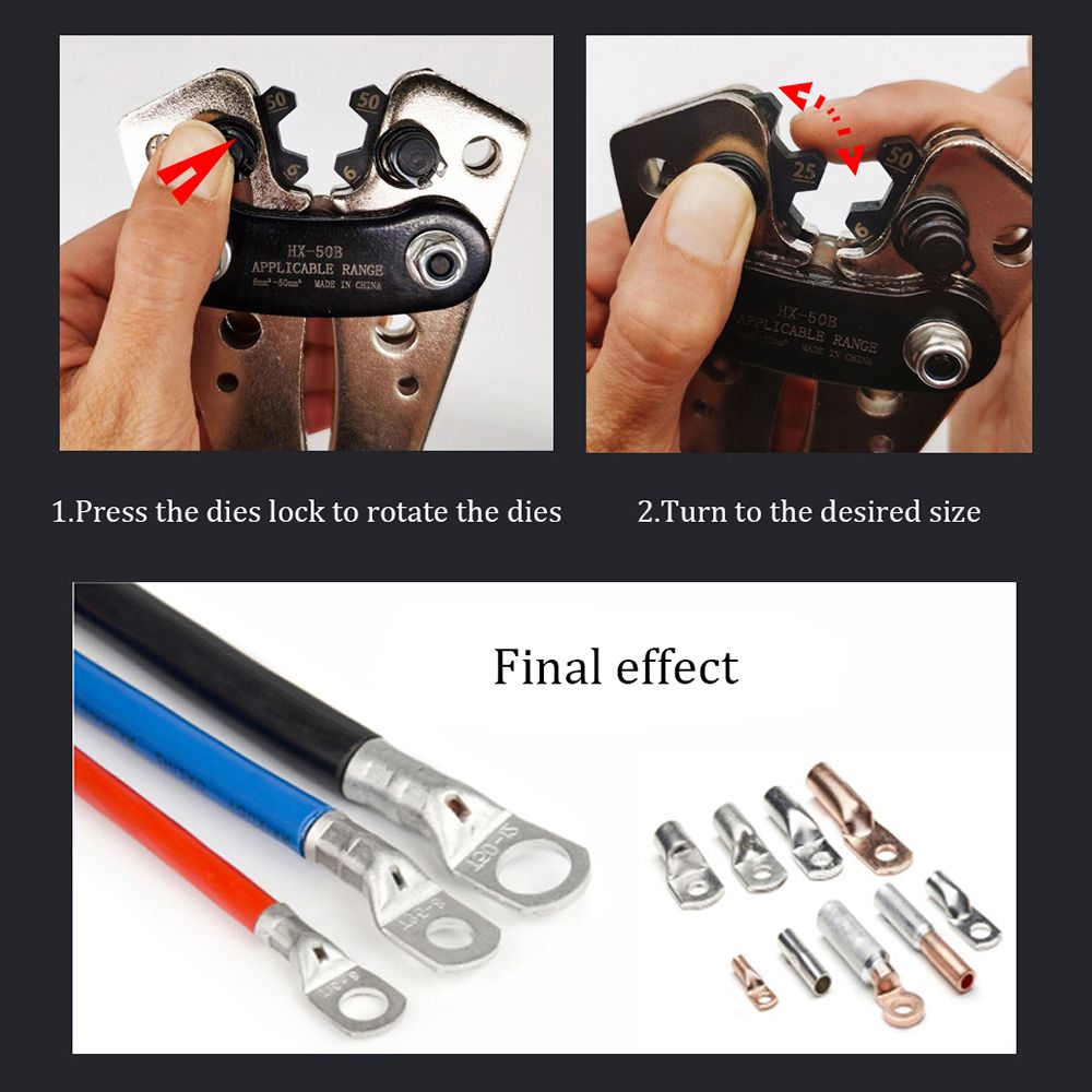 It has a crimping capacity from 6-50mm²(Similar to AWG 10, 8,6,4,2,0), providing a quick and effortless solution for crimping terminals, secure and reliable.