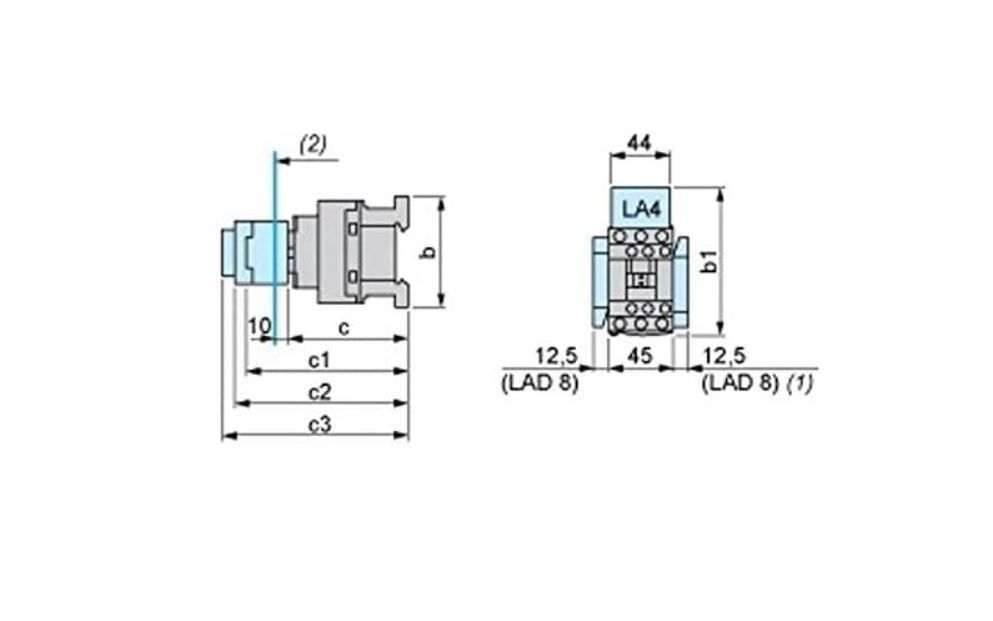 - Additional auxiliary contacts: front or side mounted auxiliary contact blocks, time delay auxiliary blocks.